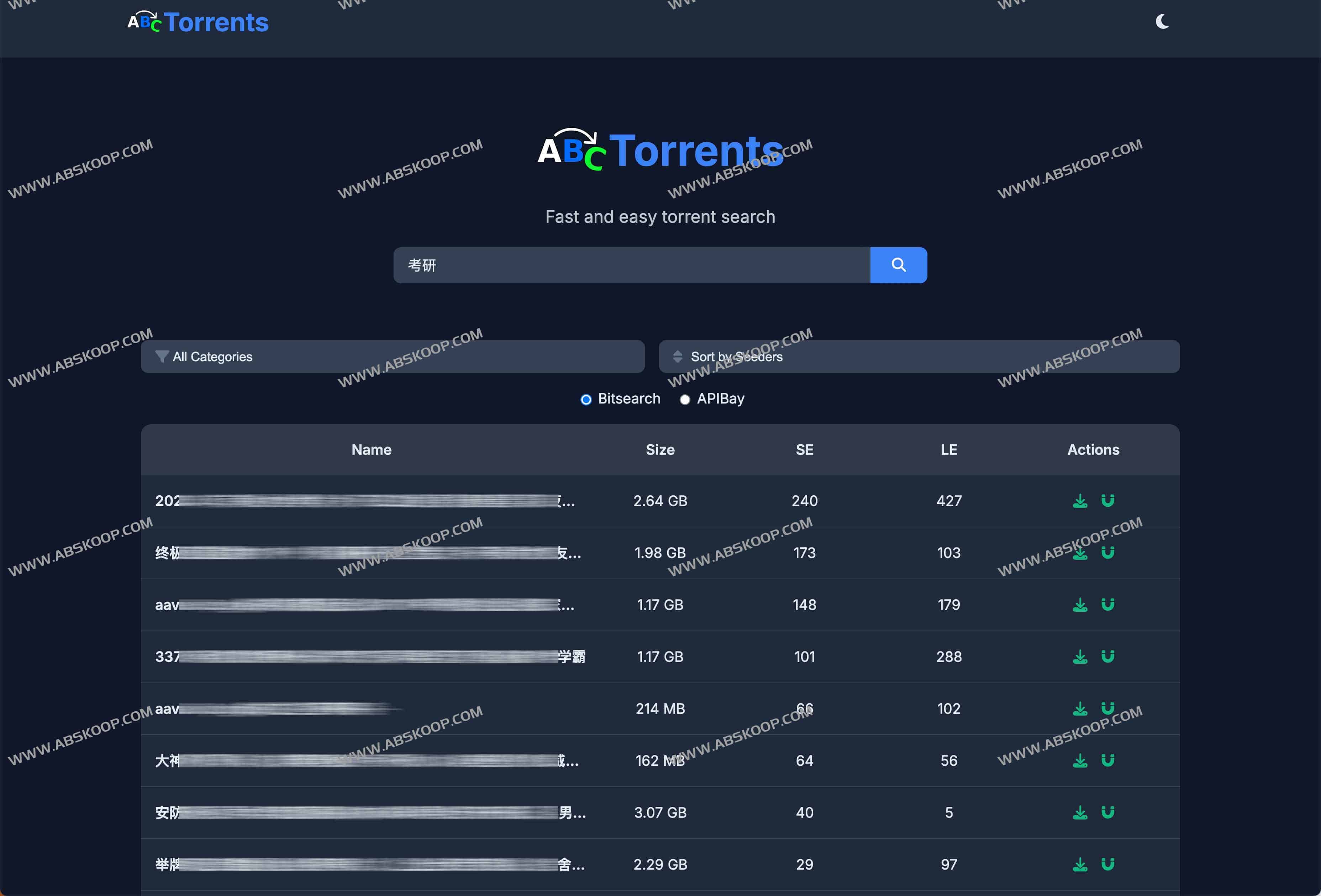 ABCTorrents提供一站式磁力搜索服务,支持多种资源类型,包括电影、软件、游戏、动漫与电子书种子,便于用户快速定位所需内容. 界面简洁明了,内置常见关键词检索和磁力链接直链提示,提升检索效率. 用户无需注册即可使用全站搜索功能,完全免费,无需第三方插件或付费订阅. 搜索结果页面同时展示文件大小、健康度(seeders/peers)等等,帮助用户做出下载决策. 支持中文资源检索,覆盖国内外热门站点,满足多元化需求。