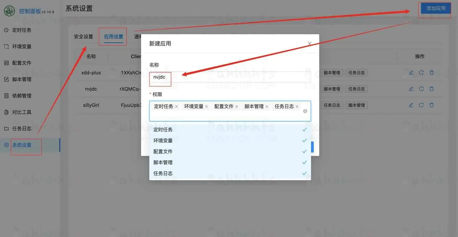 1.添加应用,输入名称,勾选权限