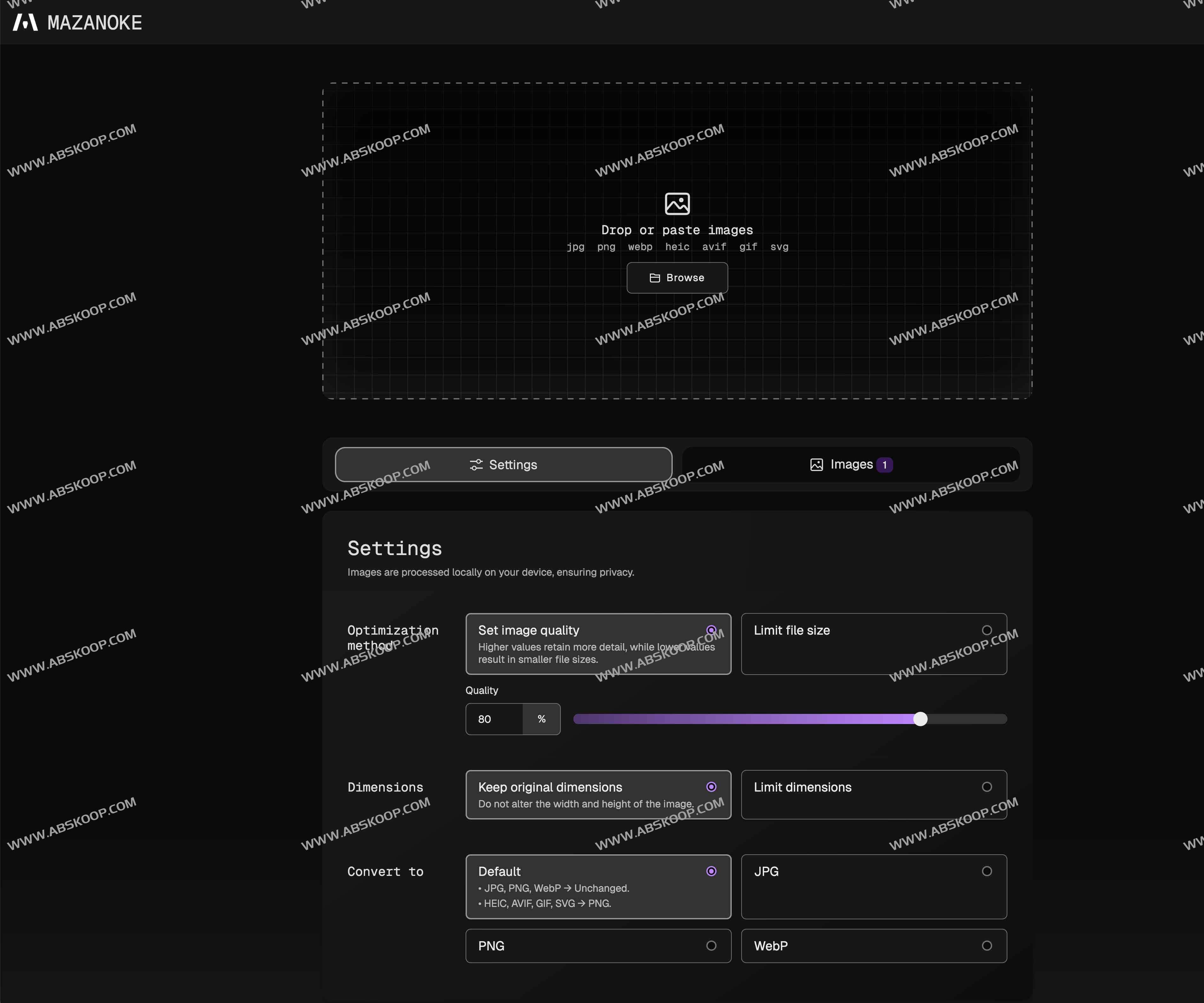 MAZANOKE覆盖主流图像格式的压缩与转换,用户可在界面中调整质量参数或设定目标文件大小,并对宽度和高度进行限制。支持JPG、PNG、WebP之间的互转,并能将HEIC、AVIF、GIF、SVG批量转换为PNG格式。剪贴板粘贴功能让操作更便捷,而清除EXIF数据可移除位置与时间等敏感信息,进一步强化隐私保护。
