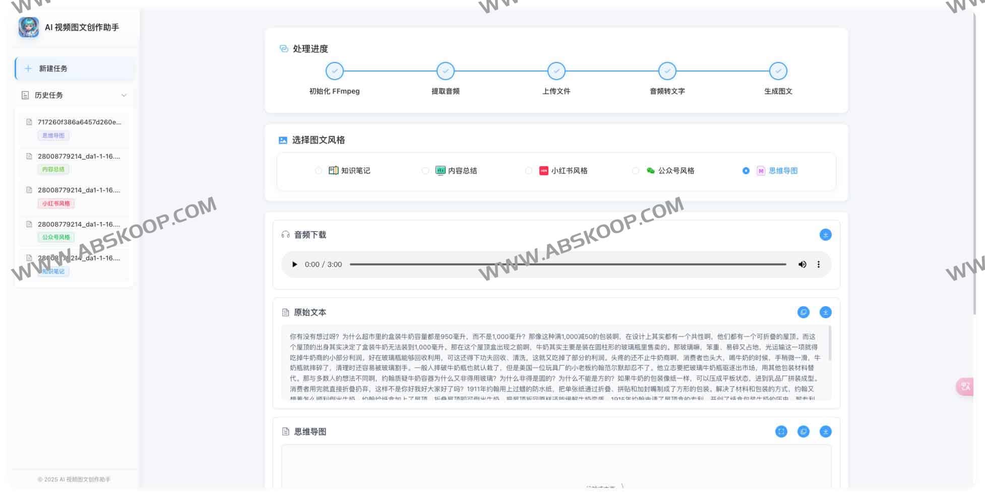 - 选择输出文档风格(小红书/公众号/知识笔记/思维导图)。
