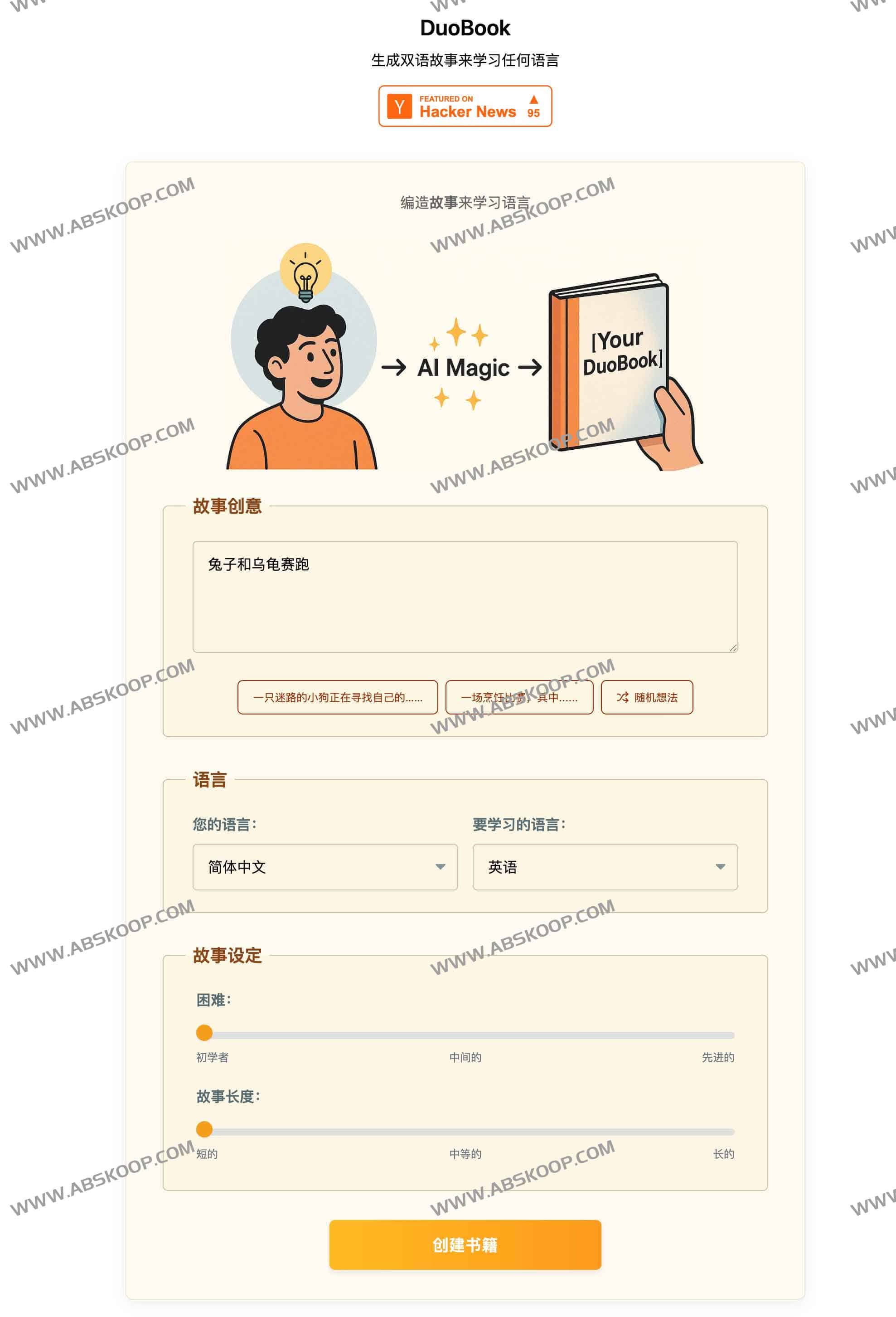 DuoBook是一个在线通过AI生成双语故事来学习任何语言的平台网站, 借助人工智能技术,自动生成符合用户需求的双语故事,让学习者在沉浸式阅读中自然而然地吸收新词汇。平台覆盖110种语言,每位学习者都能围绕感兴趣的主题,定制独一无二的故事内容。读者在阅读时可随时点击单词或句子,获得即时翻译与词汇注释,同时支持听发音功能,帮助构建精准语感。