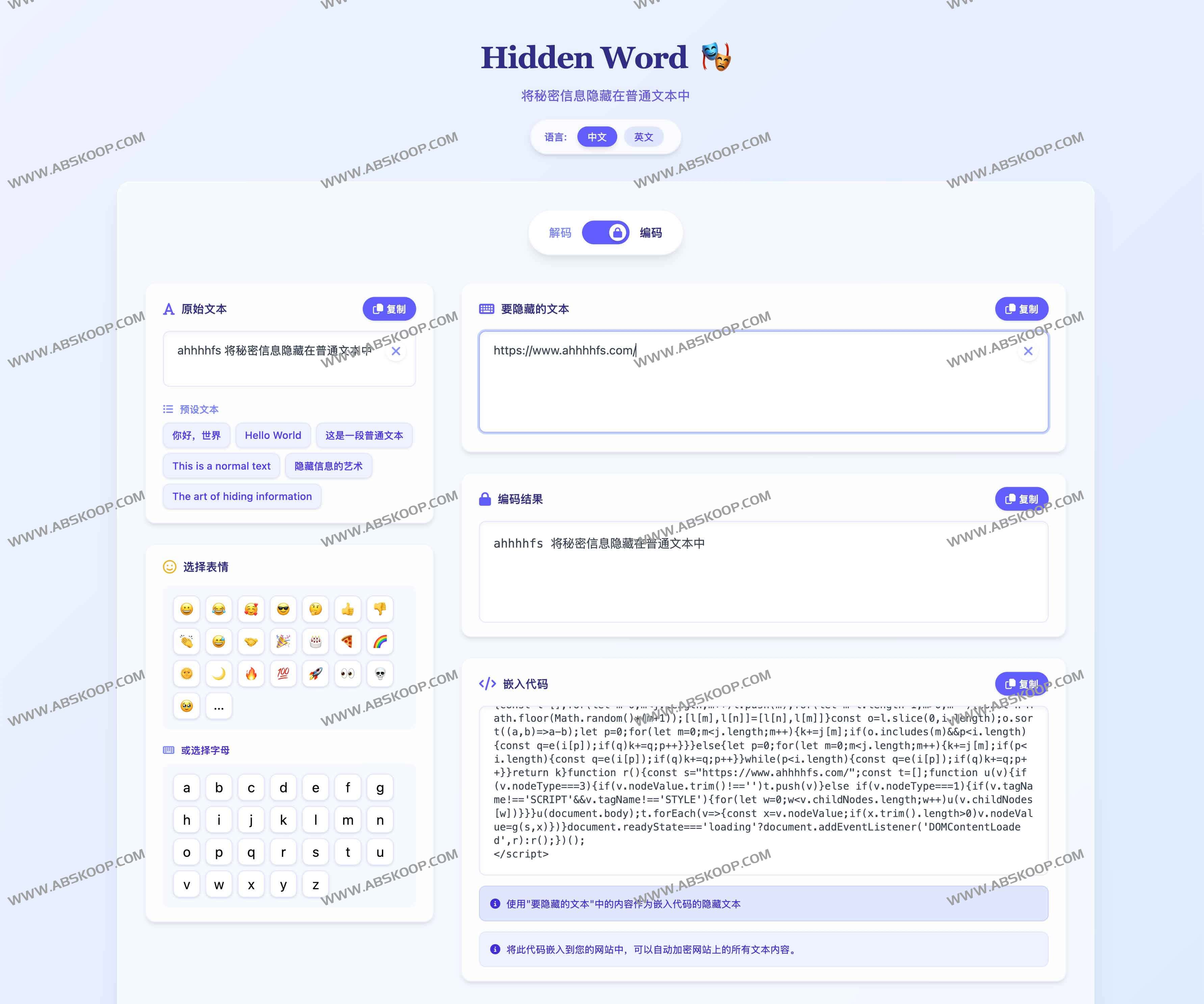 Hidden Word是一个文本数字水印工具, 利用 Unicode 特殊字符,将秘密信息以不可见方式植入普通文本。它能够在文章或网页内容中隐藏密码、版权标识、元数据等关键信息。解密时,隐藏内容便会显现,帮助创作者有效保护原创成果并追踪内容来源。该工具免费使用,无需注册,即刻集成到任何支持 Unicode 的平台。