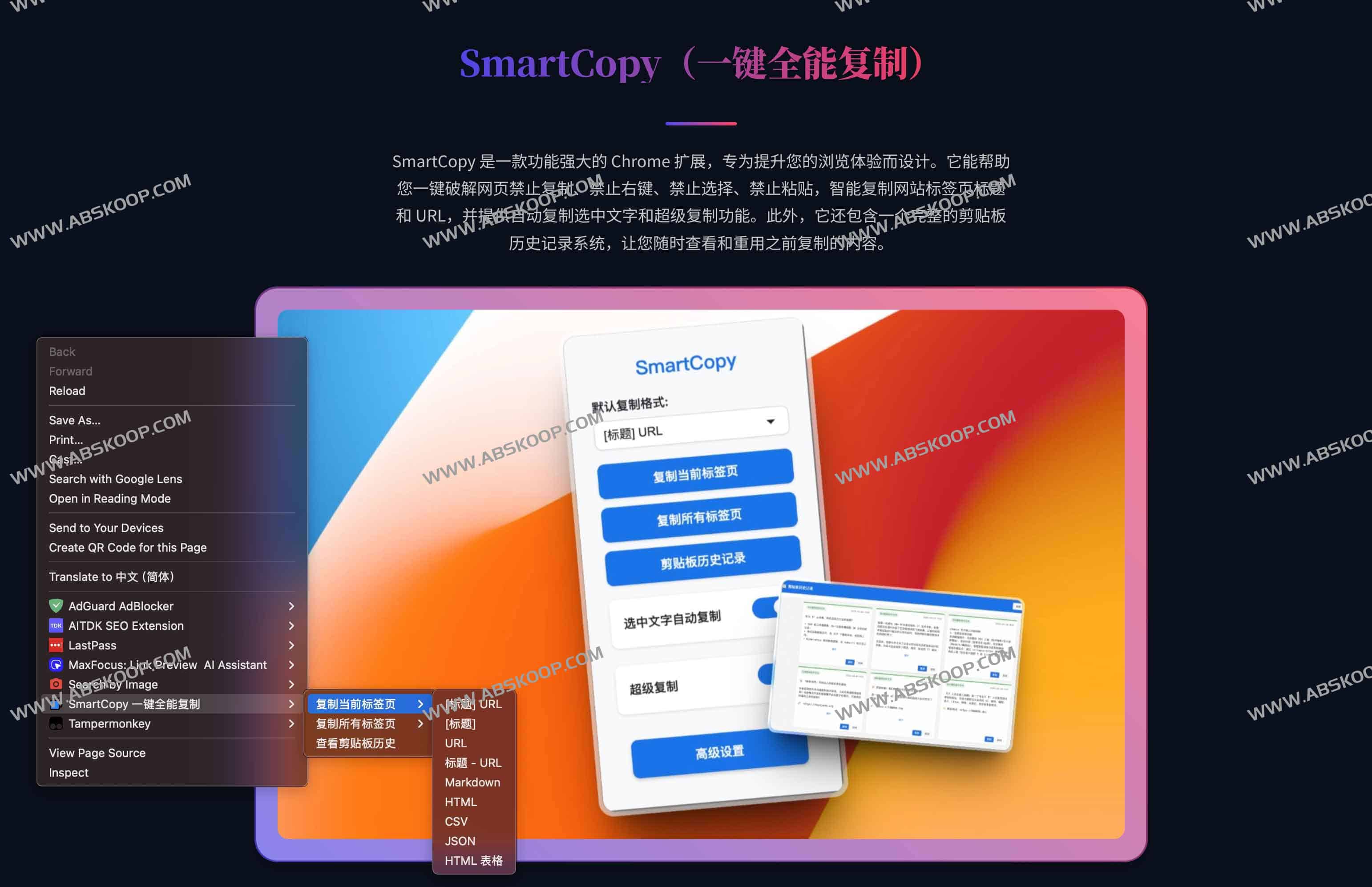 SmartCopy 是一款专为 Chrome 浏览器设计的扩展工具,能够一键解除网页对复制、右键、选区和粘贴的种种限制,帮助用户在受限页面中自由复制内容。它还支持多格式标签页信息导出、自动复制选中文字、快捷键操作以及完整的剪贴板历史记录管理,满足内容创作者和 IT 从业者的多样需求。