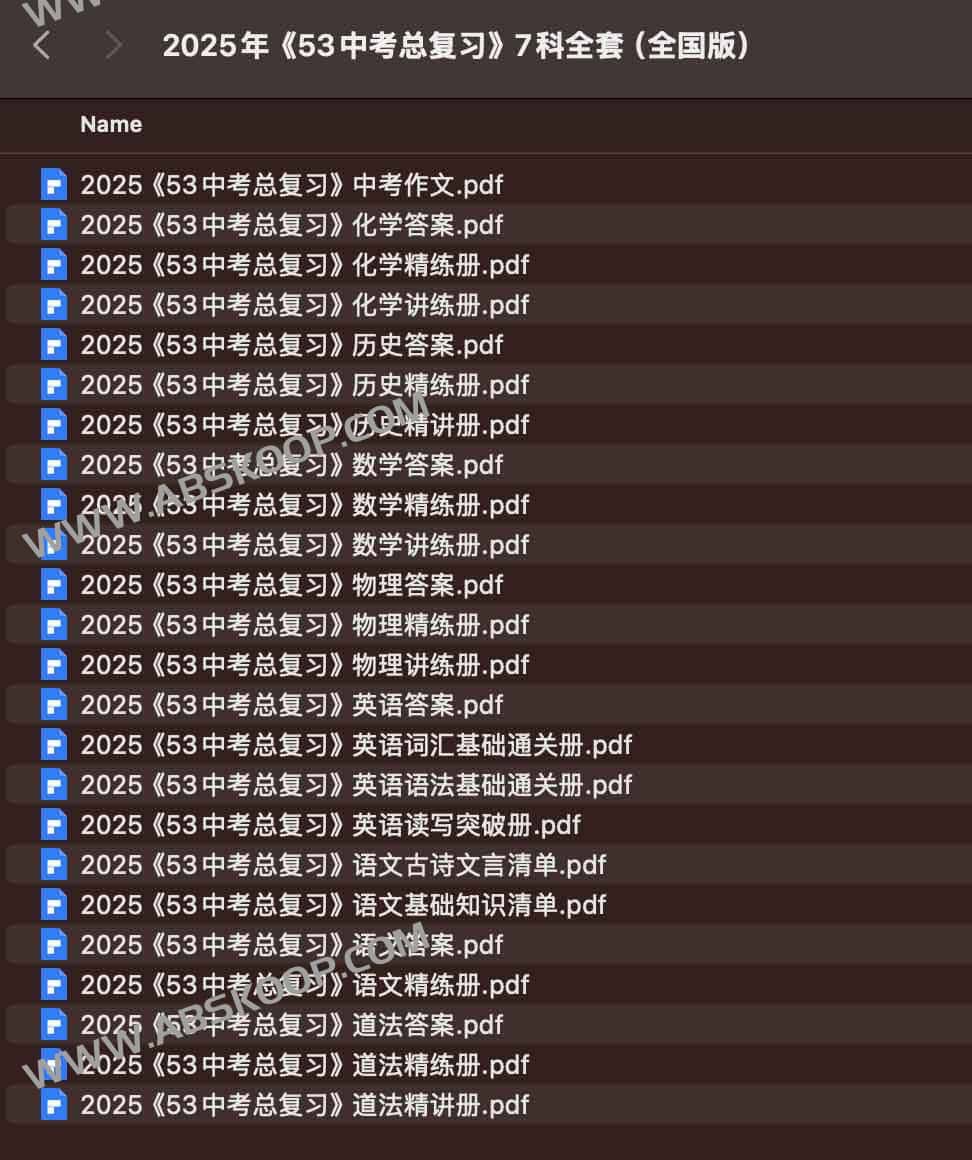 2025年《53中考总复习》7科全套(全国版),夸克网盘课程。这套2025年全国版《53中考总复习》覆盖中考7大核心科目,包含语文、数学、英语、物理、化学、历史、道法的完整复习体系。每科配备答案详解与专项训练组合,语文科目特别设置古诗文言清单和基础知识手册,英语学科则细分词汇语法双通关及读写专项突破。物理、化学等理科科目采用讲练结合模式,历史与道法科目配置精讲精练双路径。整套资料针对全国中考命题趋势设计,通过答案精析帮助考生查漏补缺,配合分层训练实现知识巩固与能力提升。