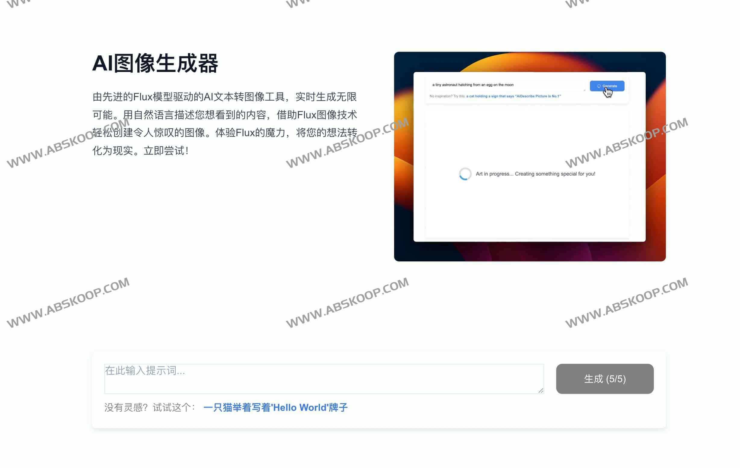 由先进的Flux模型驱动的AI文本转图像工具,实时生成无限可能。用自然语言描述您想看到的内容,借助Flux图像技术轻松创建令人惊叹的图像。体验Flux的魔力,将您的想法转化为现实。