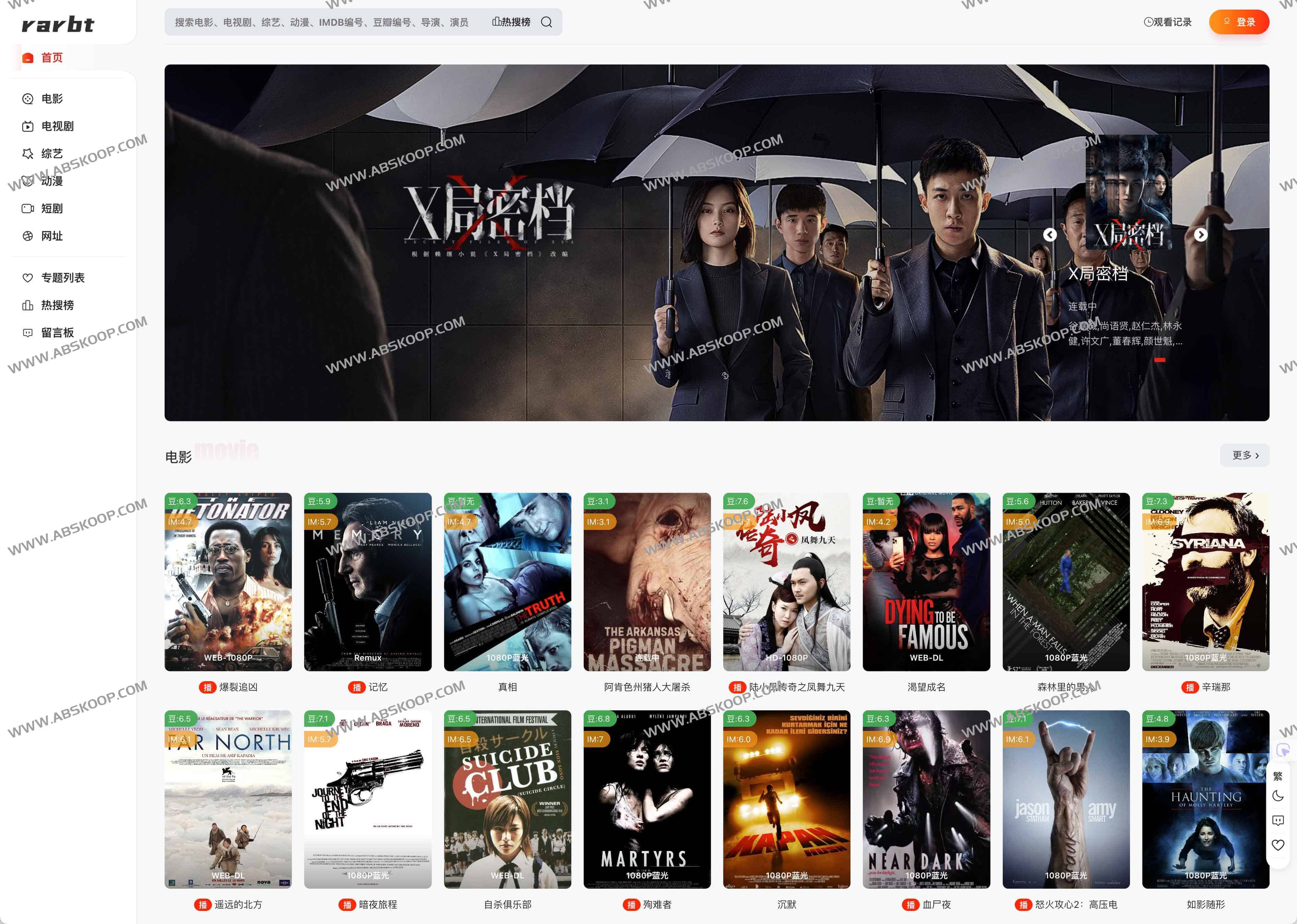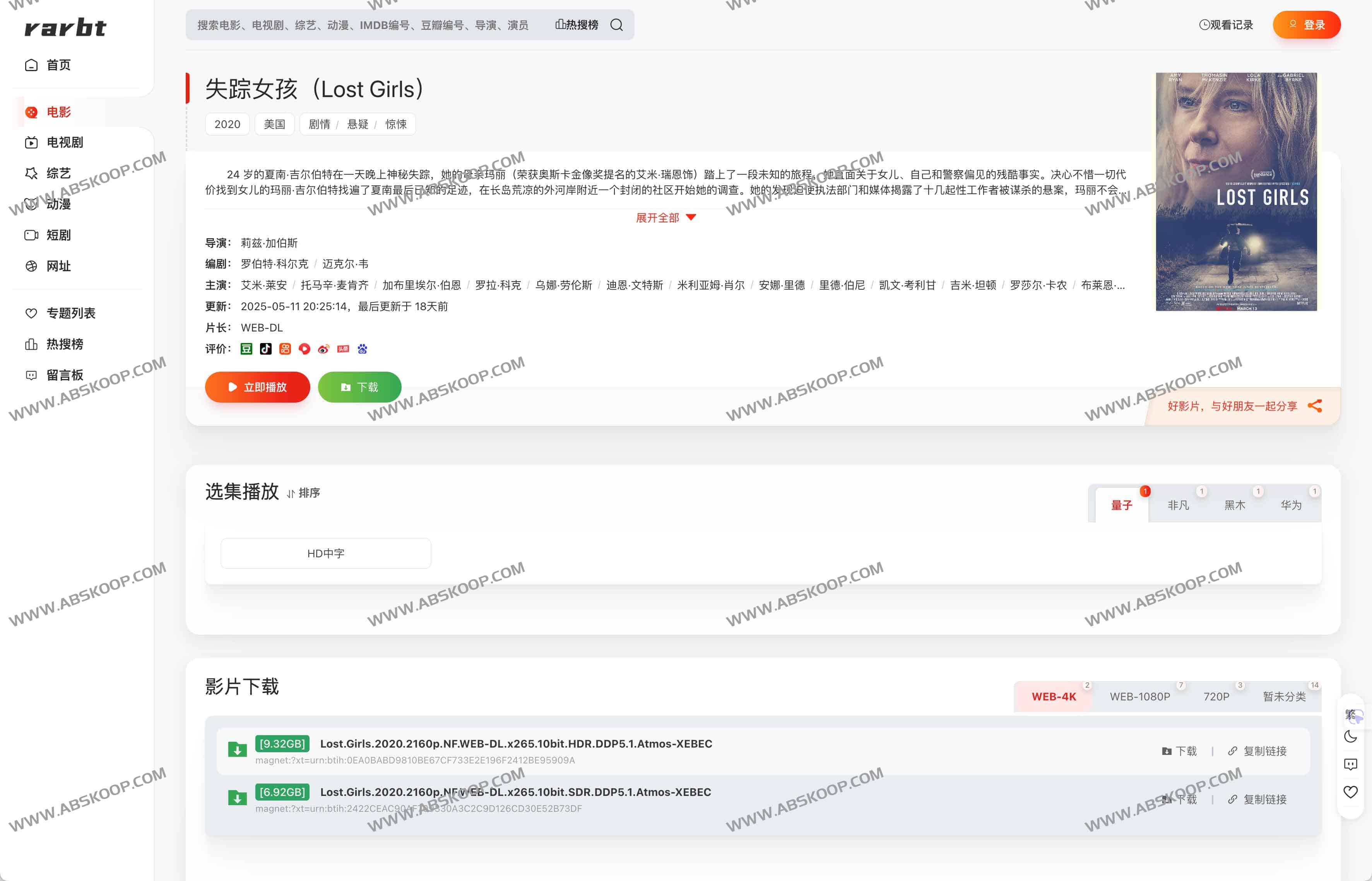 RARBT(www.rarbt.fun)致力于为用户提供丰富多样的影视资源,涵盖电影、电视剧、综艺、动漫等多个类别。平台特别注重资源的高清质量,提供包括4K蓝光原盘、HD-1080p、WEB-2160p等多种清晰度选项,满足不同用户的观影需求。
