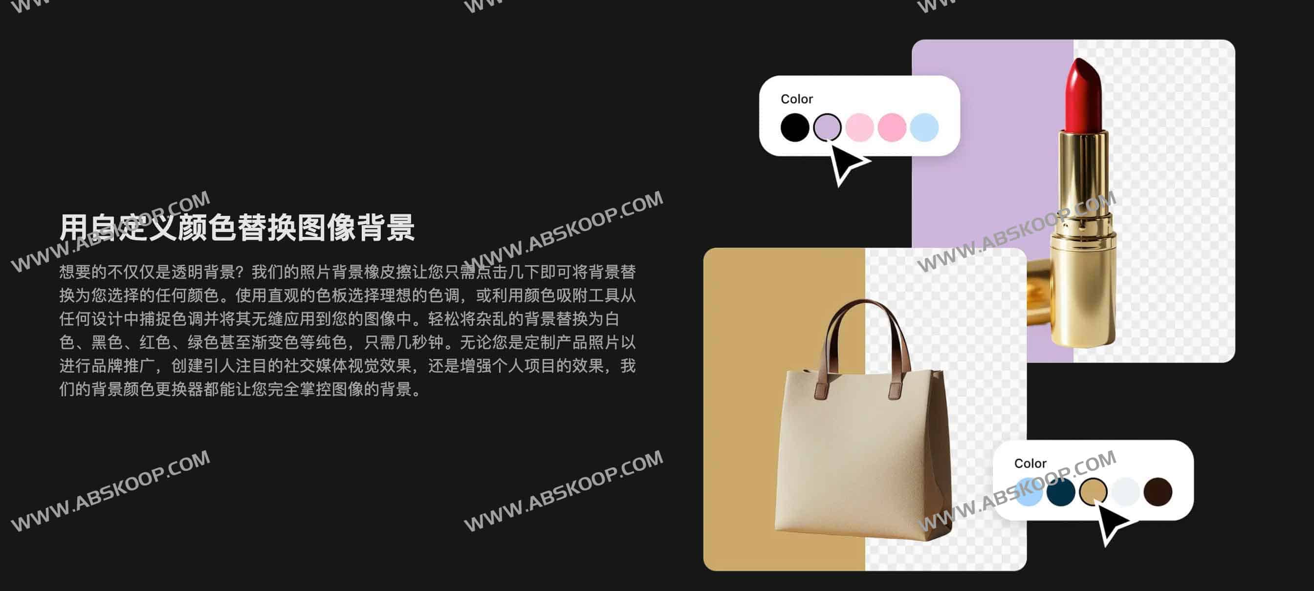 透明背景之外,工具提供丰富背景色替换功能。用户可通过色板选色,也能使用颜色吸取工具将背景替换成指定色调。支持纯色和渐变色背景,能让展示更贴合品牌风格或设计创意需求,如白背景用于产品主图,彩色背景用于社交图或广告视觉。