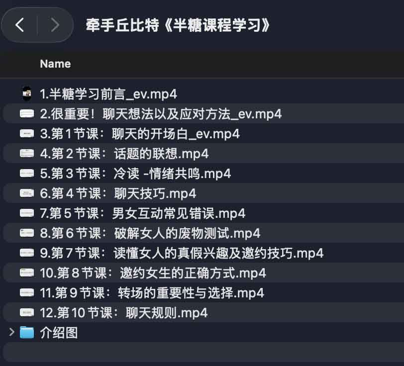 牵手丘比特推出的《半糖课程学习》由十一段视频组成,围绕从心态准备到实际邀约的全流程展开。课程兼顾理论与实战,帮助学员在与异性交谈时既保持自然真诚,又能巧妙引导对方情绪,提高互动质量。课程内容环环相扣,覆盖从心态准备到邀约落地的各个步骤,适合希望提升异性聊天质感、增强情感吸引力的学员反复观看与练习。