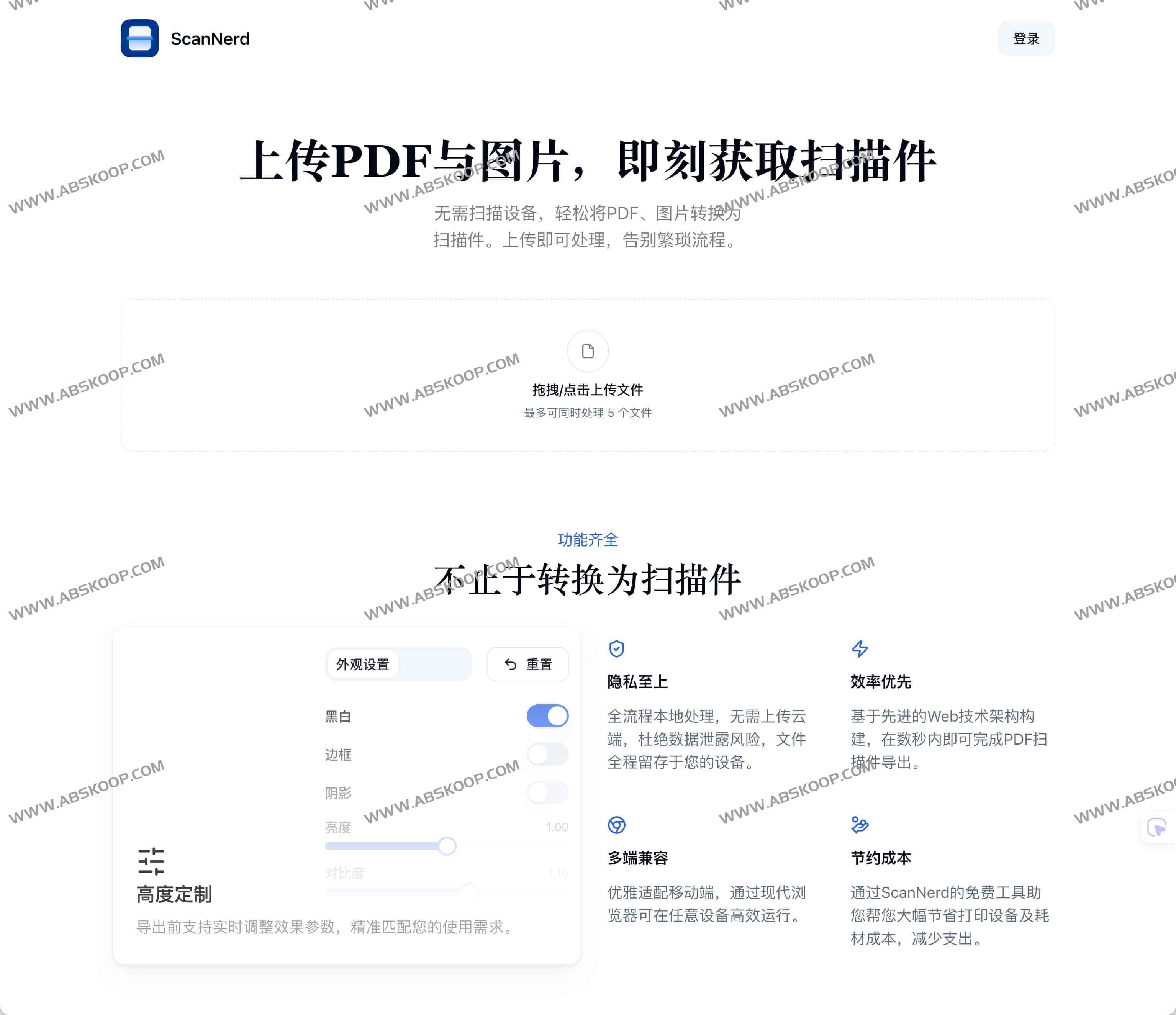 ScanNerd 是一款基于浏览器的免费网页应用,无需任何硬件即可把 PDF 与图片快速转换成带有真实扫描质感的文件,支持一次性处理最多 5 个文档,通常数秒就能完成导出。整套流程完全在本地运行,文件不会离开用户设备,隐私安全得到根本保障。