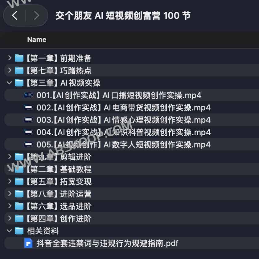 交个朋友AI短视频创富营共包含100节视频课程,覆盖从账号定位到变现落地的全流程。学员将系统学习前期准备、基础操作、AI视频实操、创作进阶、选品策略、运营推广、热点蹭流、剪辑技巧与变现路径,配套抖音违禁词与违规行为规避指南,助力短视频创富梦想成真。