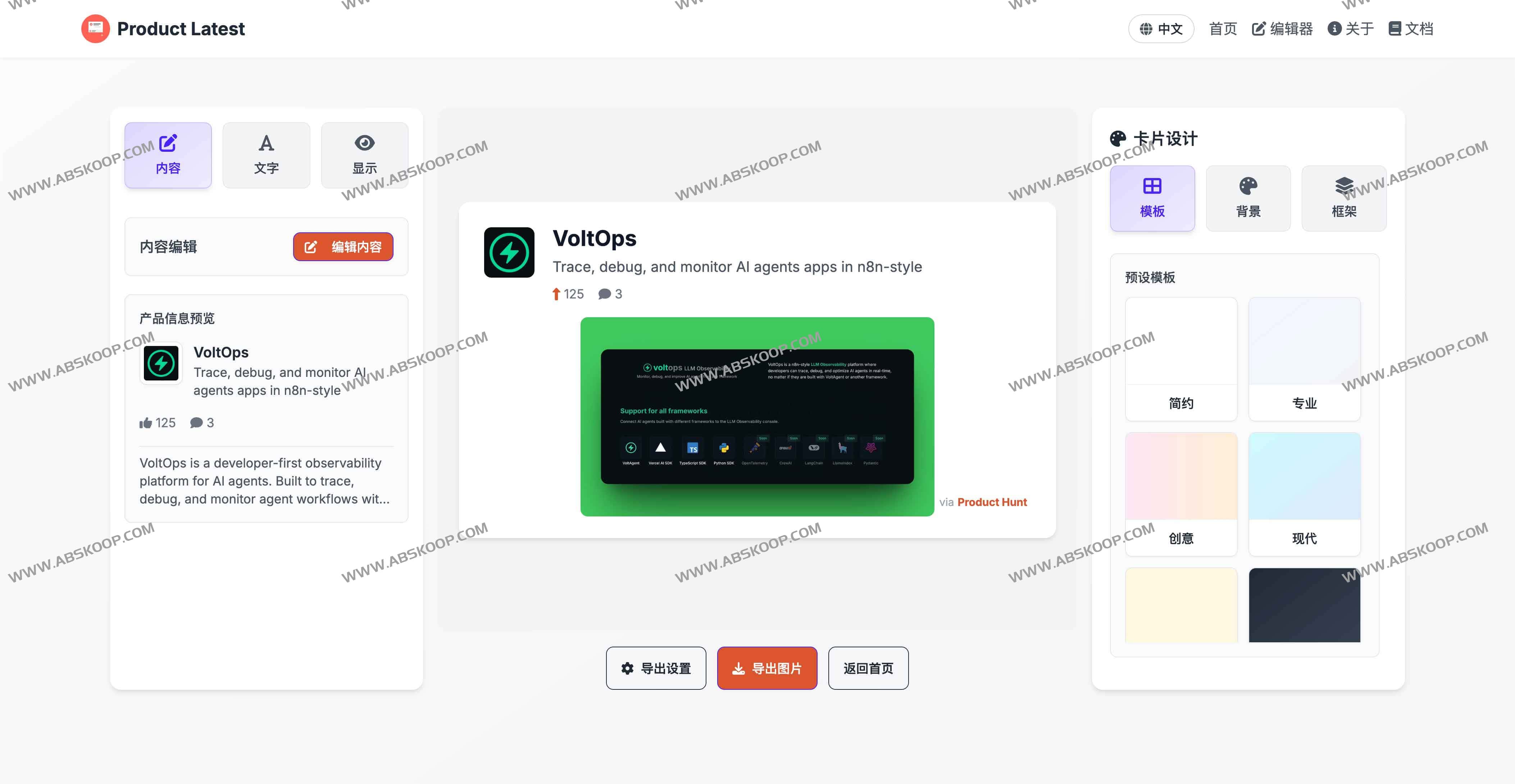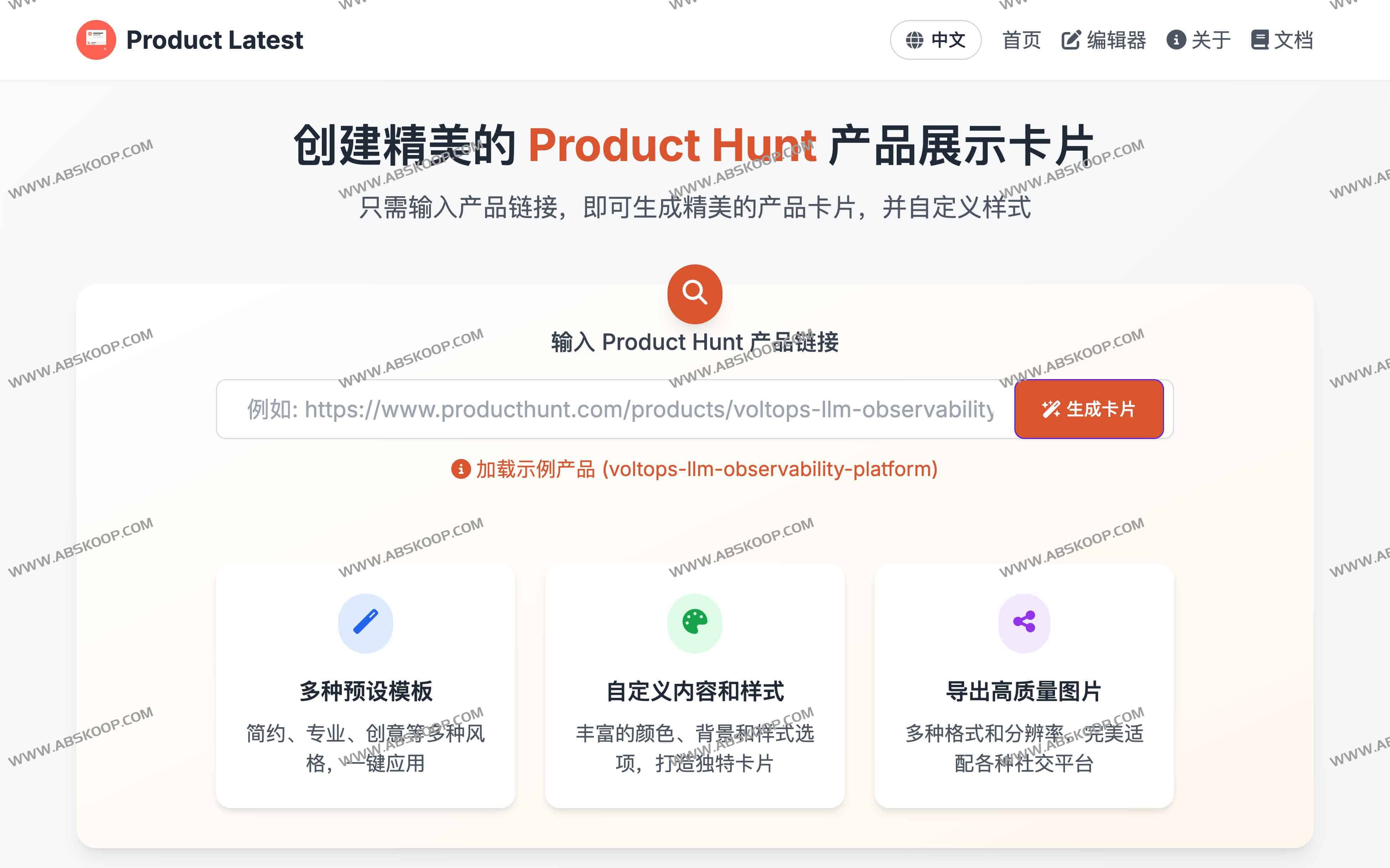 ProductLatest 是一款专为 Product Hunt 平台设计的展示卡片美化工具,让任何人在社交媒体或博客中展示产品时都拥有专业视觉效果,用户只需输入Product Hunt链接或slug,系统自动抓取产品信息并生成多模板、深度可调、支持高分辨率导出的展示卡片,让产品瞬间具备吸睛外观,并能无缝适配各大社交平台。借助内置的多种模板、主题和布局选项,每一张卡片都能精准传达产品核心价值,为内容创作者和产品经理带来极高效率和参与度提升。