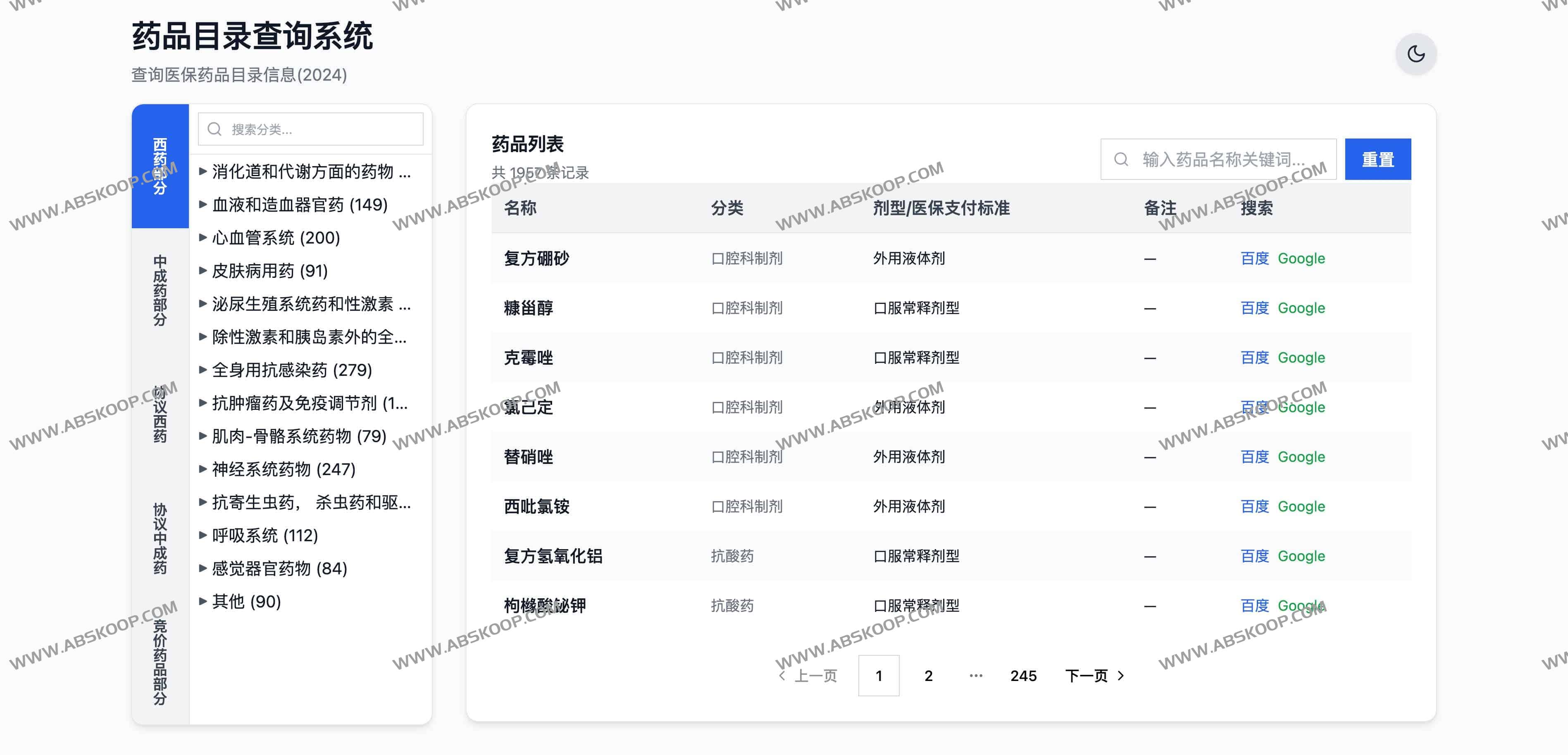 药品目录查询系统是一款一个现代化的医保药品目录查询系统,使用React + TypeScript + Tailwind CSS构建,工具提供2024年医保药品目录信息查询,系统以国家医疗保障局官方发布的《国家基本医疗保险、工伤保险和生育保险药品目录(2024年)》构成本系统的数据基础。目录涵盖西药、中成药、协议西药、协议中成药以及竞价药品等多个部分,确保信息权威可靠。每种药品的名称、分类、剂型及搜索链接均有详细展示。用户可通过查询功能获取所需药品信息,同时也提供了各个药品在百度和Google的搜索链接。