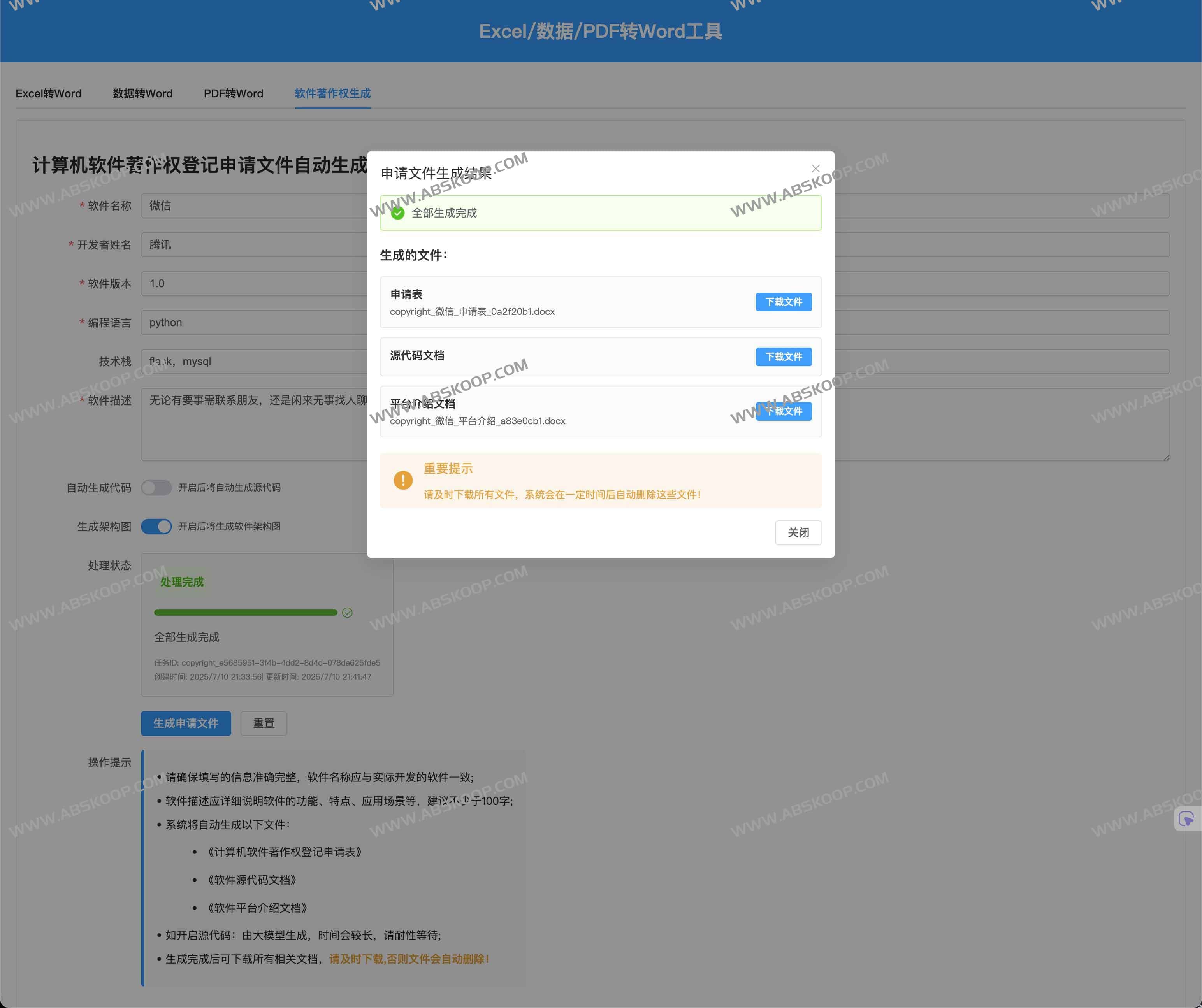 软件著作权生成工具,是一款免费的在线工具,一键生成计算机软件著作权登记文件,并且提供Excel转Word、数据转Word、PDF转Word等多种文档转换工具,特别针对软件著作权登记需求,支持一键生成完整申请文件,包括登记申请表、源代码文档和平台介绍文档。页面也列有版权信息和备案号,保障正规合规。
