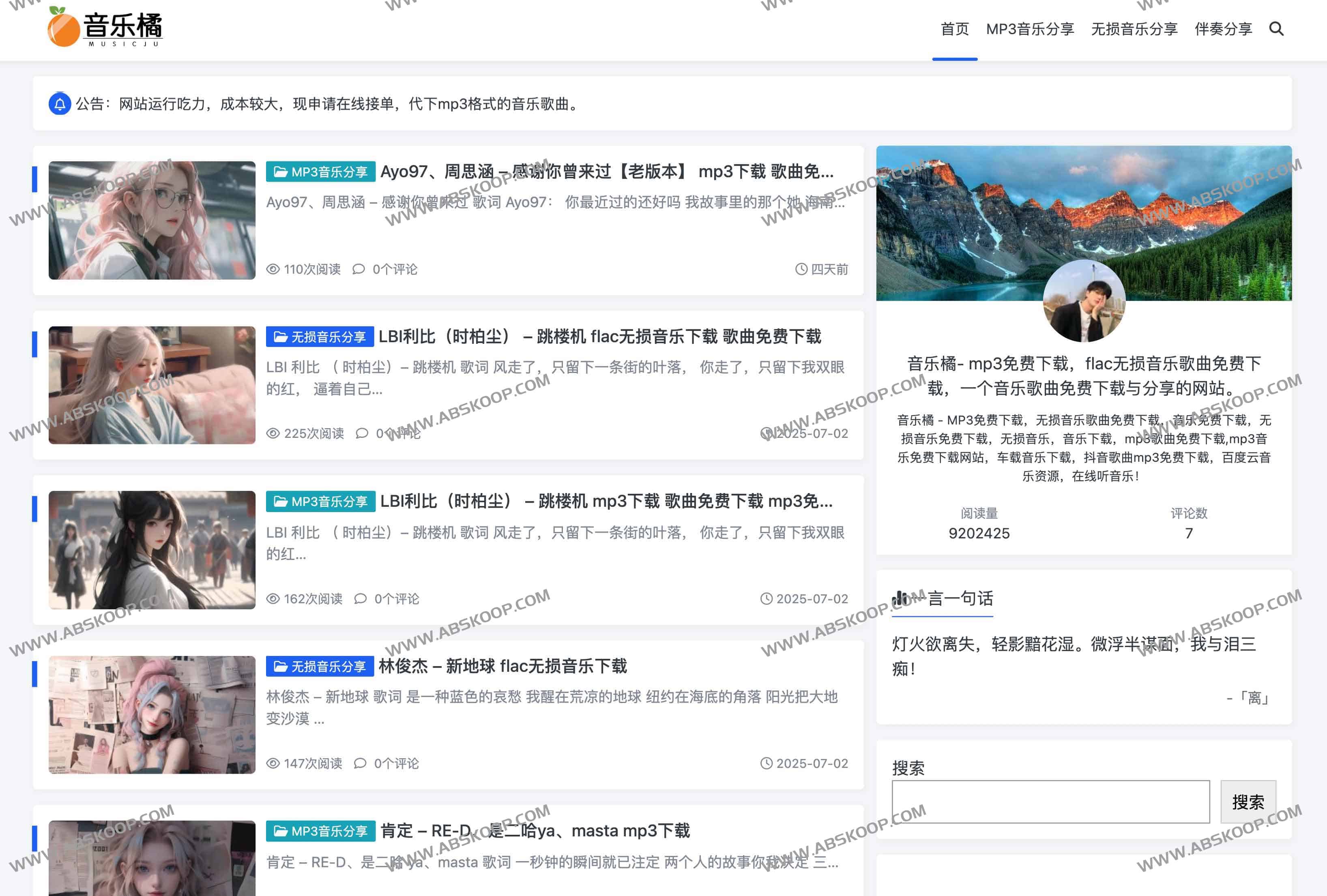 音乐橘是一个以「免费下载」为核心的音乐资源站点,提供 MP3 与 FLAC 等无损格式歌曲,并允许用户在线浏览与检索 。站内曲库覆盖流行、民谣、影视原声等多种类型,页面分页超过百余页,长期更新新曲与经典专辑 。