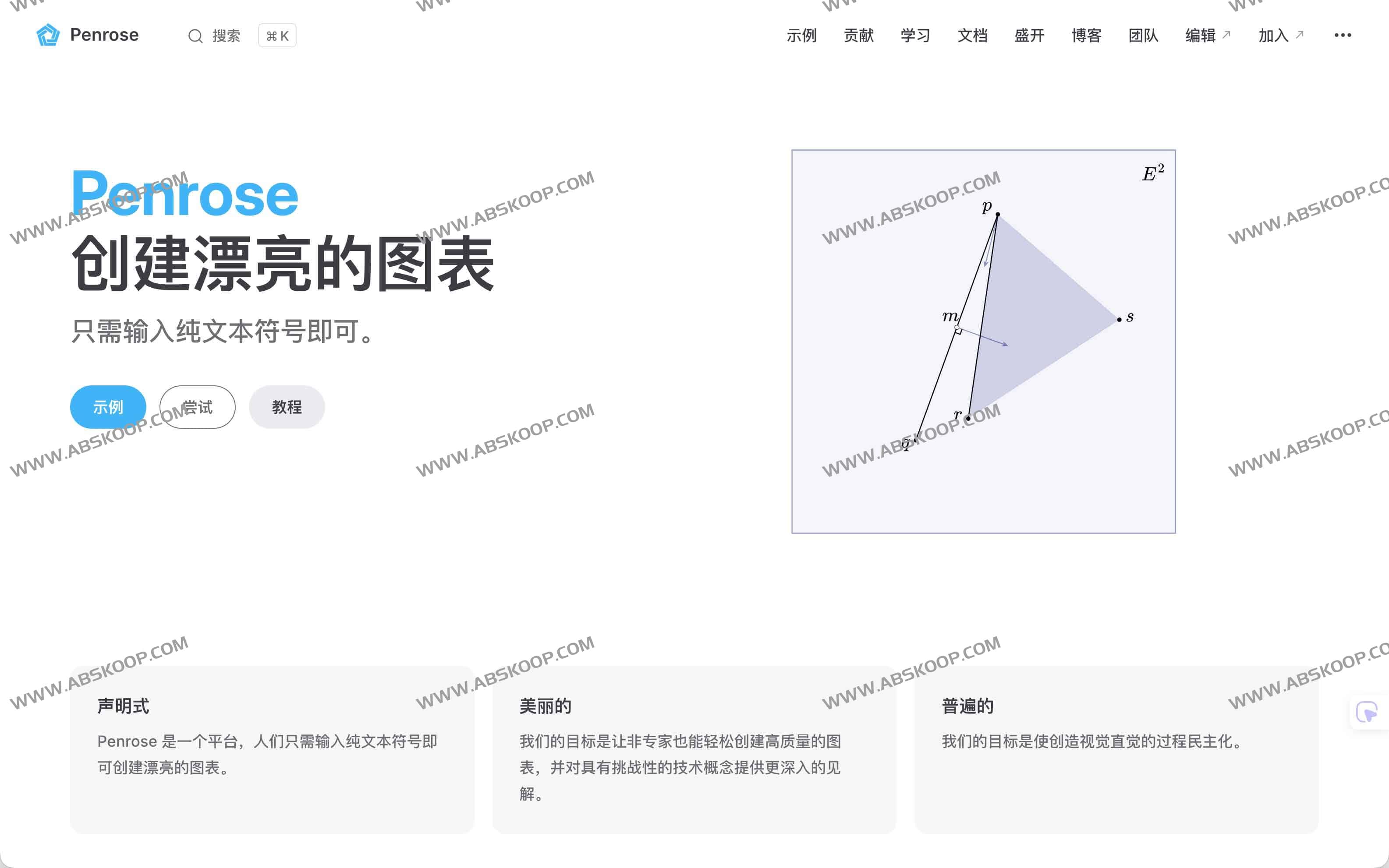 Penrose是一个用纯文本符号一键生成高质量数学与技术图表的平台,彻底改变了传统的图表制作方式。用户只需要输入简单的文本符号和数学记号,就能自动生成精美的专业图表。这个平台的核心理念是降低图表制作的门槛,让没有专业设计背景的人也能轻松创建高质量的视觉内容。 由卡内基·梅隆大学团队开发,并以 MIT 许可证开源。这一设计让缺乏设计经验的研究者、教师及学生也能快速获得可视化成果,并加深对复杂概念的直观理解,非常不错。