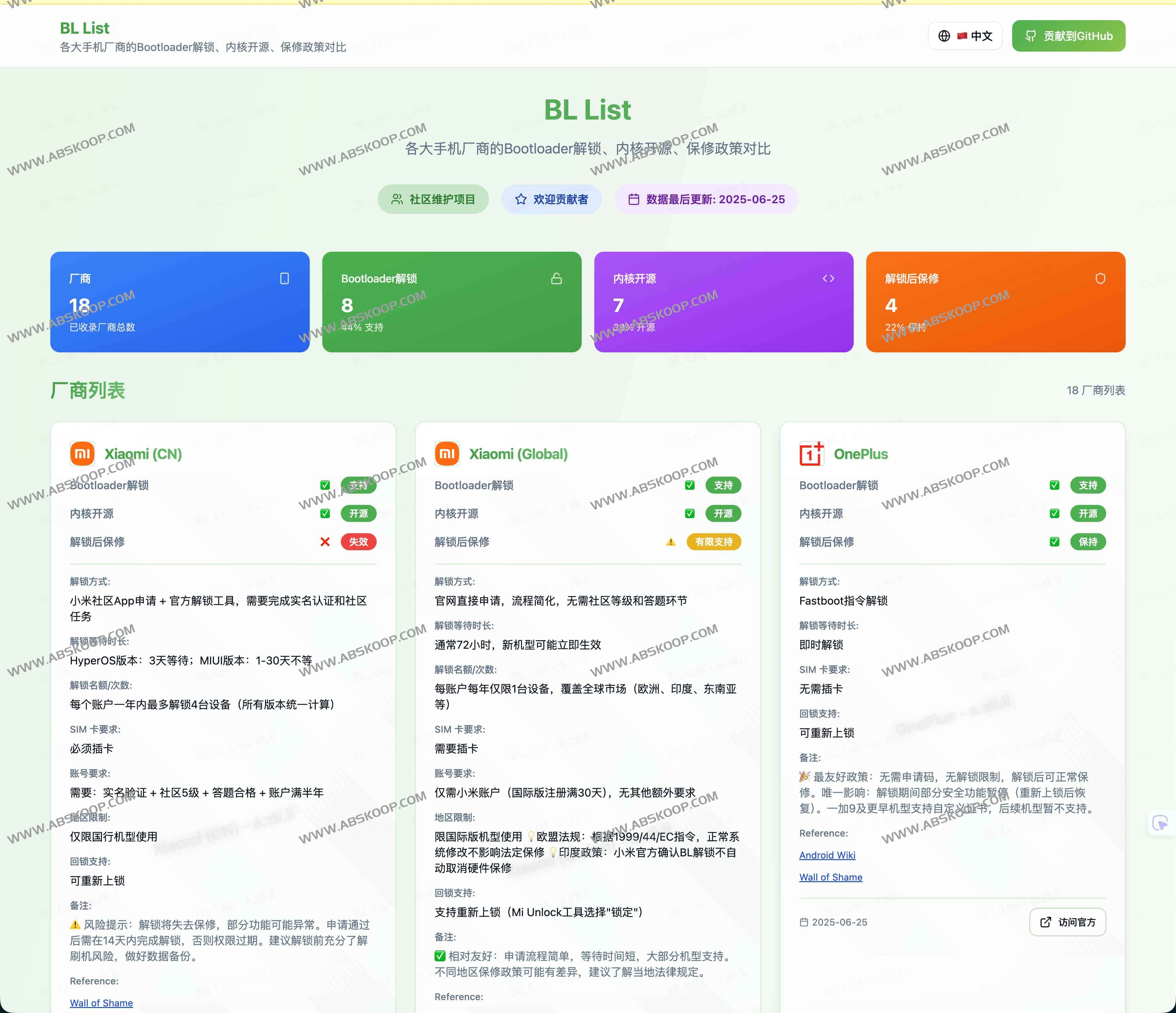 BL List是一个提供各大手机厂商的Bootloader解锁、内核开源、保修政策对比的项目,该项目以社区维护的方式,为用户提供各大 Android 厂商在 Bootloader 解锁、内核源代码开放以及保修政策方面的对比信息。支持中、印、英三种语言的 SEO 优化,采用响应式卡片与网格布局,并通过 GitHub Actions 实现自动部署至 GitHub Pages。