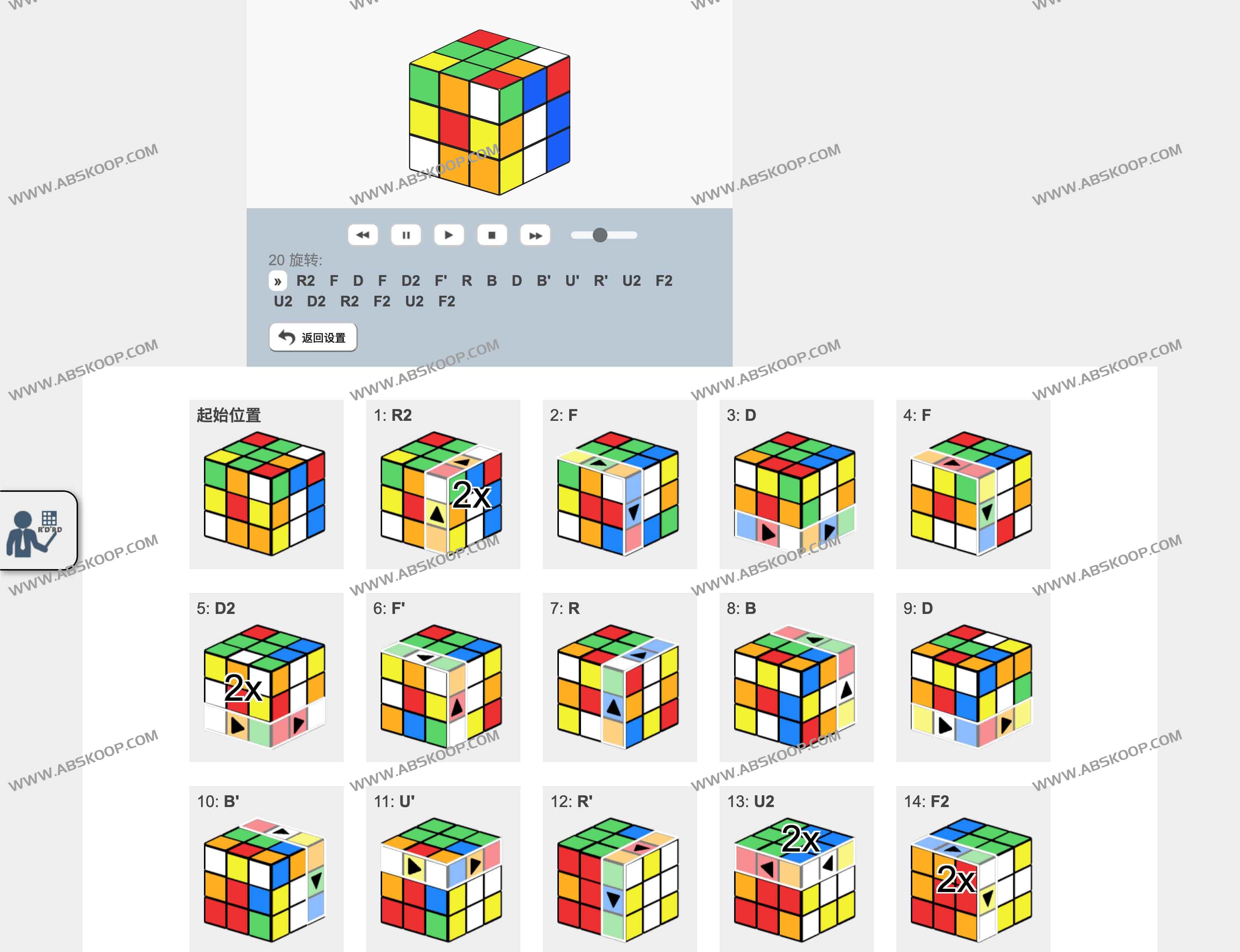 - 点击「求解」后,程序开始计算并在页面上方显示旋转序列,同时提供动画演示;操作完毕即可复原实体魔方。