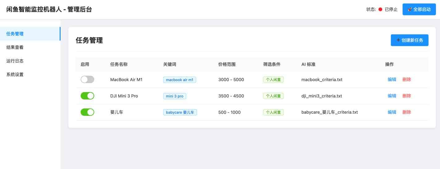 .env,设置闲鱼账号及推送服务参数;编辑config.json填写关键词、价格范围等。 - 启动Web管理界面: