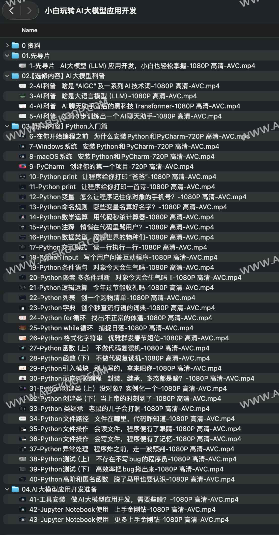 小白玩转AI大模型应用开发课程,本套课程由四大板块组成,覆盖从AI大模型基础科普到Python编程入门,再到AI应用开发环境搭建的完整流程。所有视频均为高清格式,帮助学习者快速上手并掌握关键技术要点。