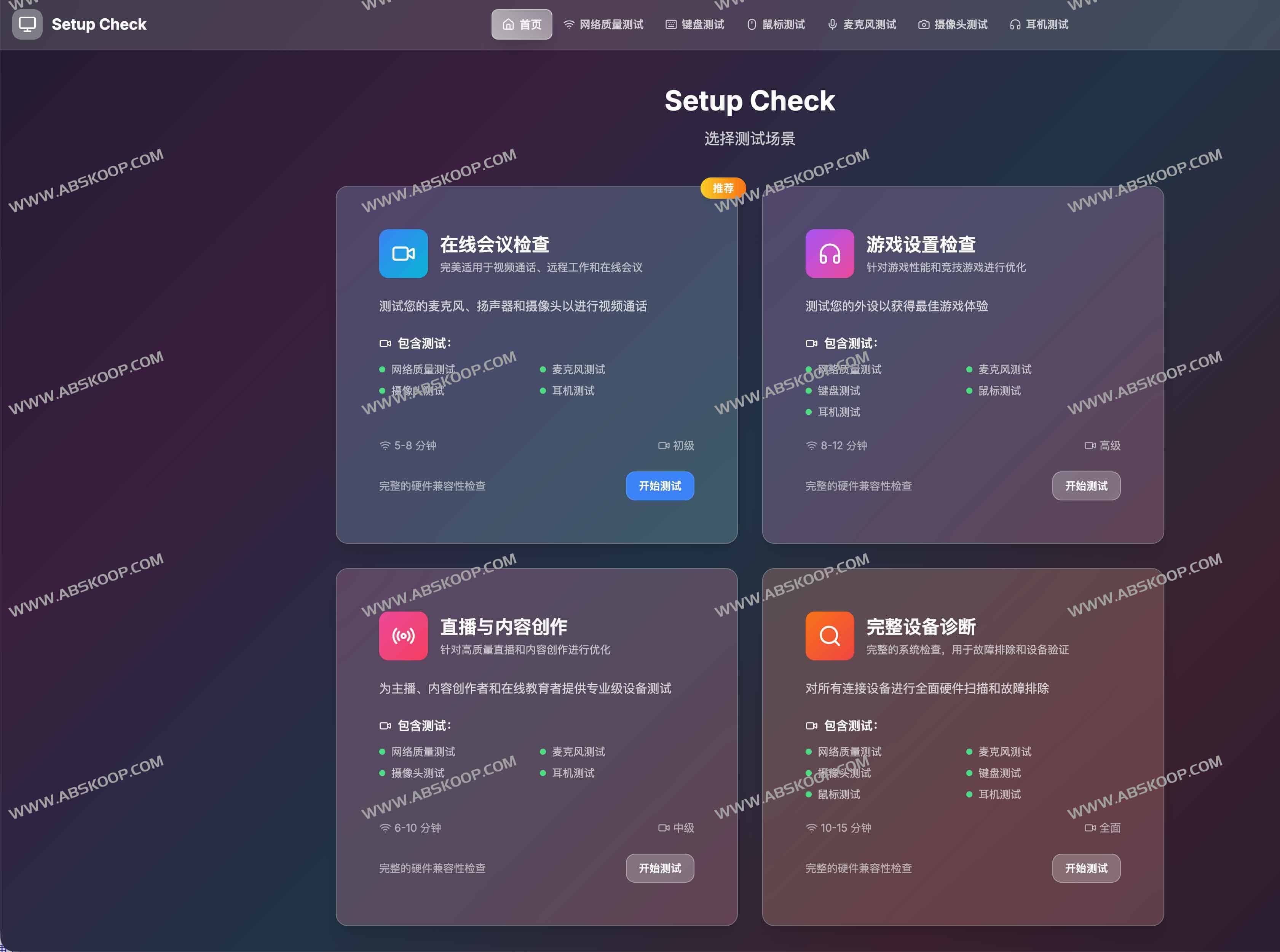 Setup Check 是一款基于浏览器的硬件兼容性检测平台, 为用户提供免费、无广告的在线设备检测服务,无需注册即可快速完成摄像头、麦克风、扬声器、键盘、鼠标和网络的兼容性检查。该平台支持 Windows、macOS、Linux、Android 和 iOS 等主流操作系统,兼容 Chrome、Firefox、Safari、Edge 等现代浏览器,可实时反馈检测结果,确保在线会议、游戏和直播等场景下硬件性能达标。