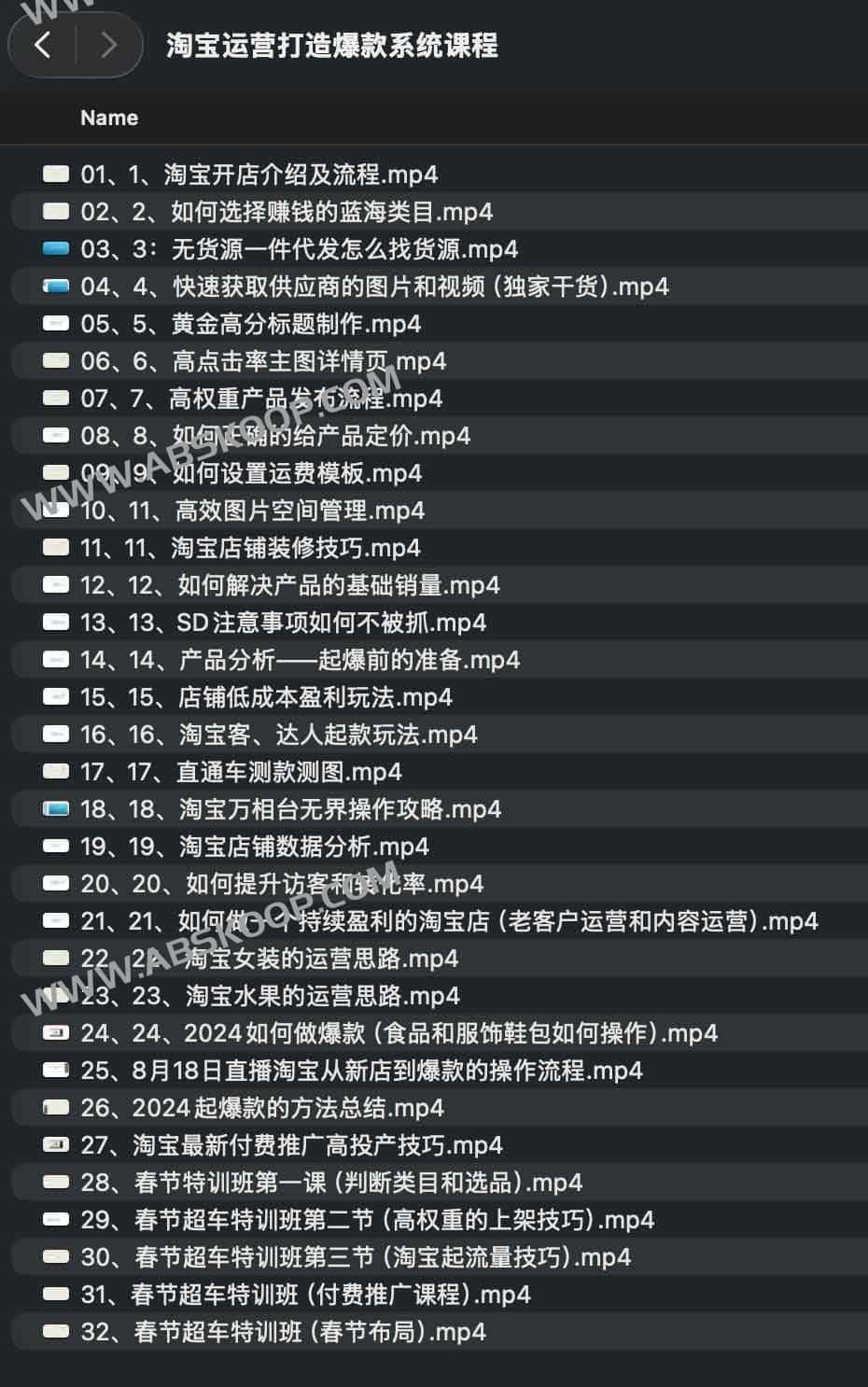 淘宝运营打造爆款系统课程,这套淘宝运营系统课程由32节视频组成,覆盖开店流程、类目选择、货源对接、供应商素材获取、标题与主图制作、产品发布与定价、运费模板设置、图片空间管理、店铺装修,到成交转化和持续盈利各环节。从零库存一件代发到直通车测款、万相台推广,再到老客运营与内容运营,模块设置紧贴实战需求。