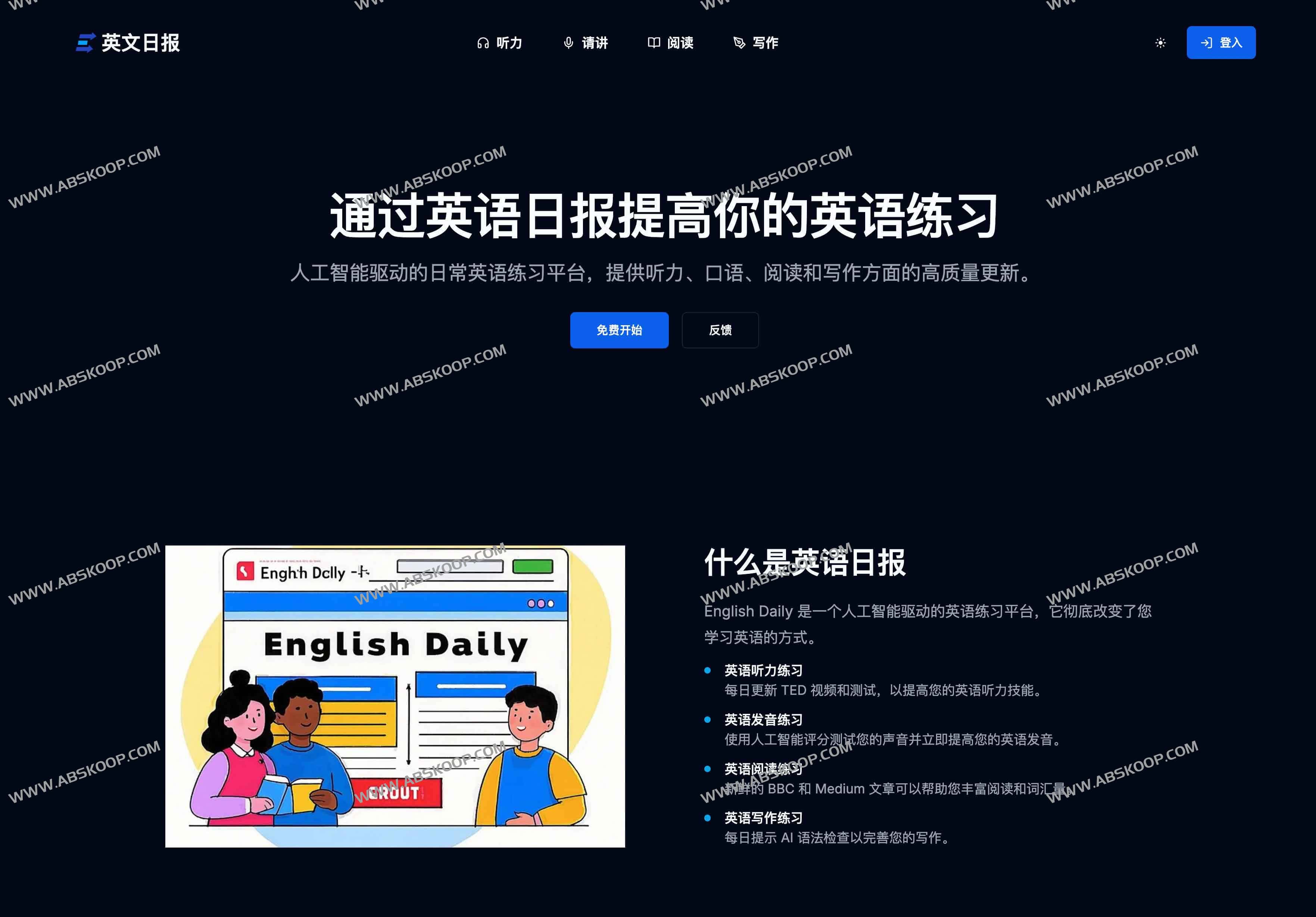 English Daily 是一款由人工智能驱动的在线英语练习平台,核心围绕“听、说、读、写”四项能力,持续提供每日高质量学习素材与互动练习。平台承诺“永久免费”,用户无需付费即可体验基础功能,包括听力 TED 视频、口语发音评分、阅读精选文章以及写作语法纠错。其 AI 引擎会根据学习行为生成个性化反馈,让练习过程更贴近真实沟通场景。