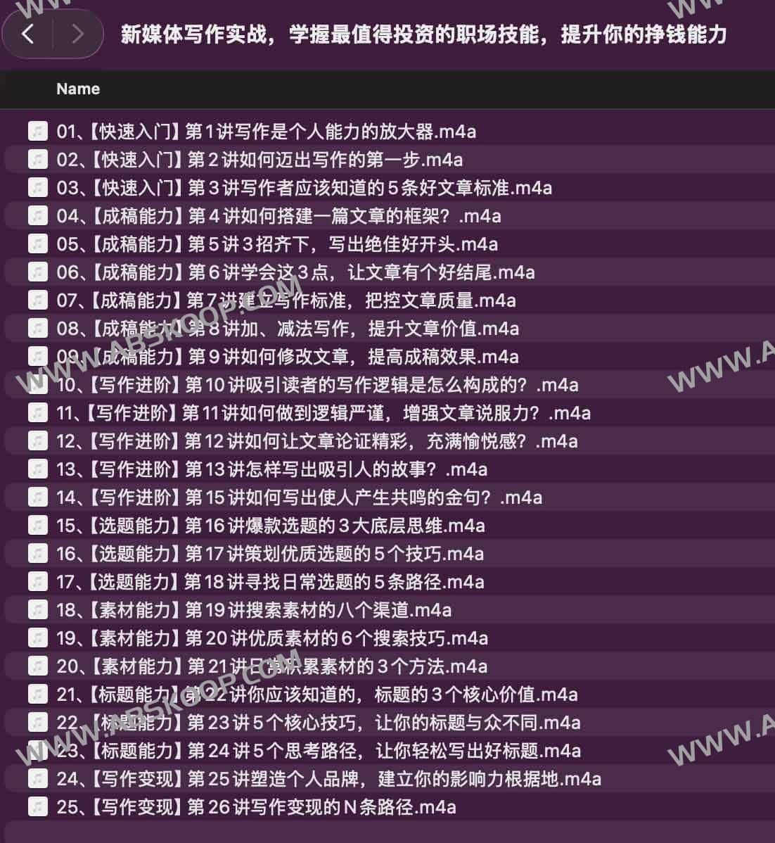 这套课程由浅入深,围绕“写作力→选题力→表达力→变现力”完整闭环设计,适合任何想通过文字实现影响力或收入增长的人学习。