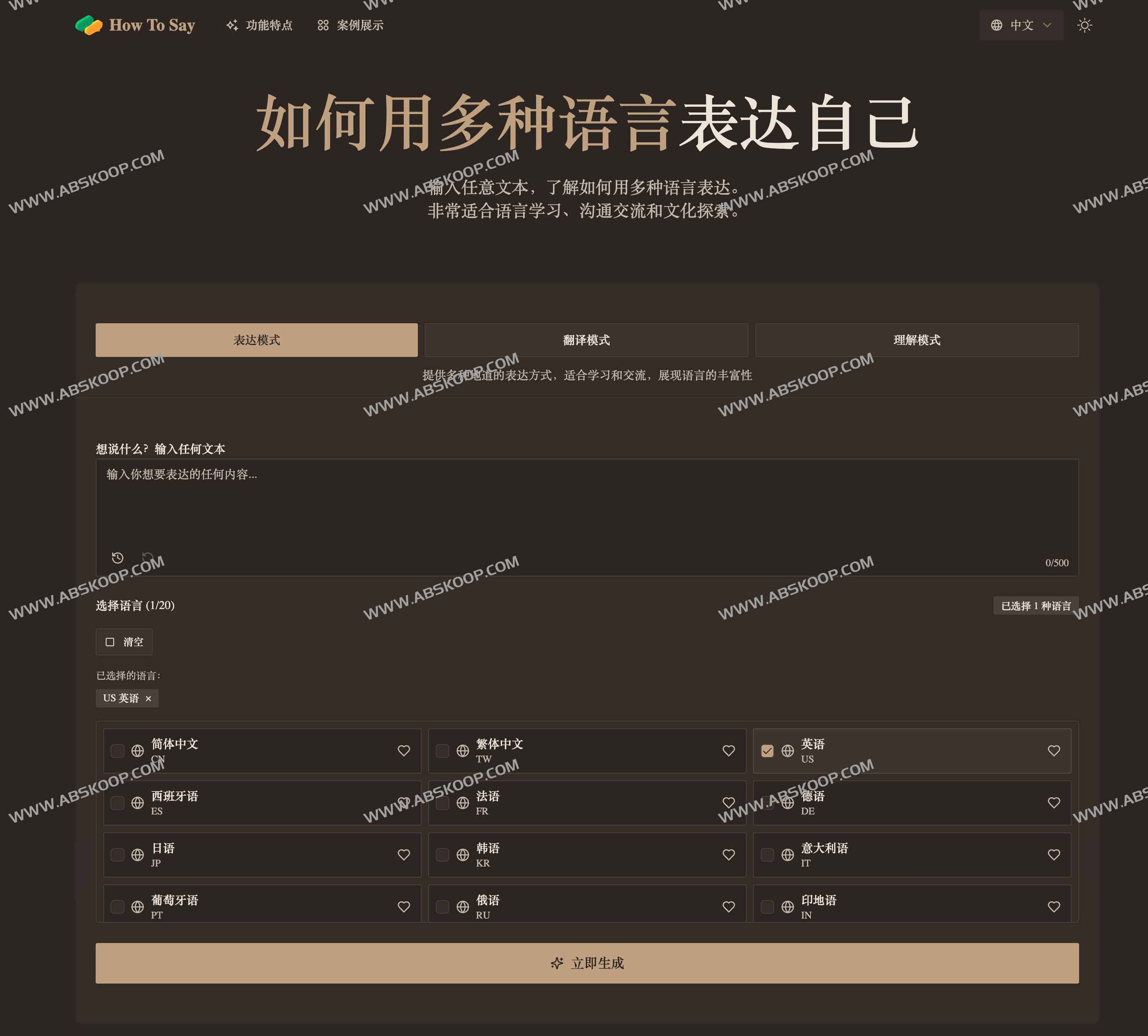 How To Say 是一款在线免费的 AI 多语言表达助手,集“表达、翻译、理解”三大模式于一身,支持 20 种主流语言、9 种表达风格和 3 类语境回复,无需注册即可在 PC 与移动端使用,帮助用户在学习、旅行、商务与社交场景中快速获得地道又精准的跨语言表达体验。