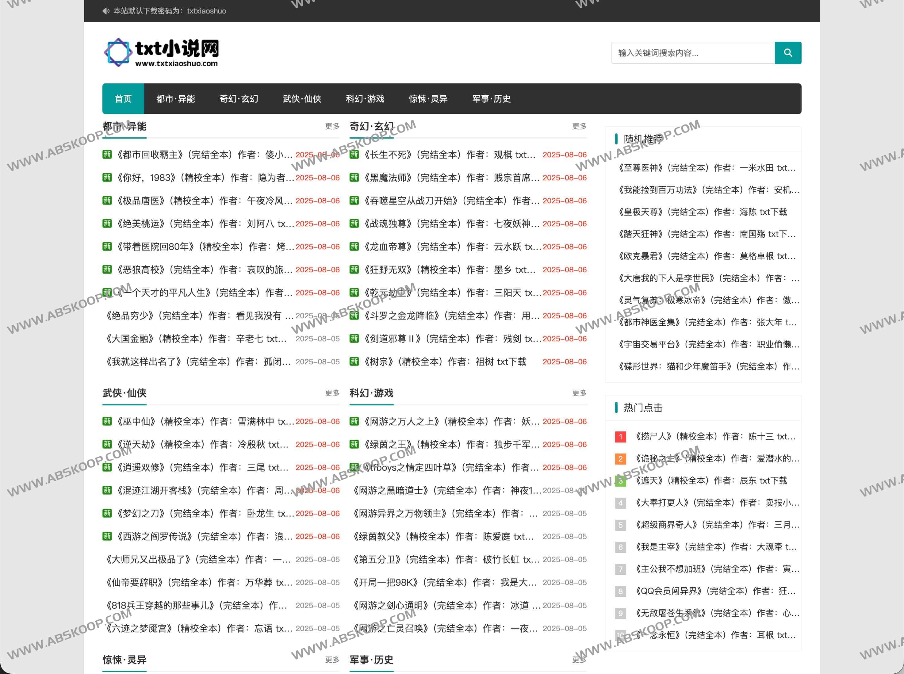 txt小说网是一个专业提供全本TXT小说下载与完结版下载的免费网站,旨在为读者搜集网络上高质量的精校全本和校对版全集小说。资源来源包括ZXCS(知轩藏书)、笔趣阁等主流免费平台,确保小说版本准确无误并具备良好阅读体验。