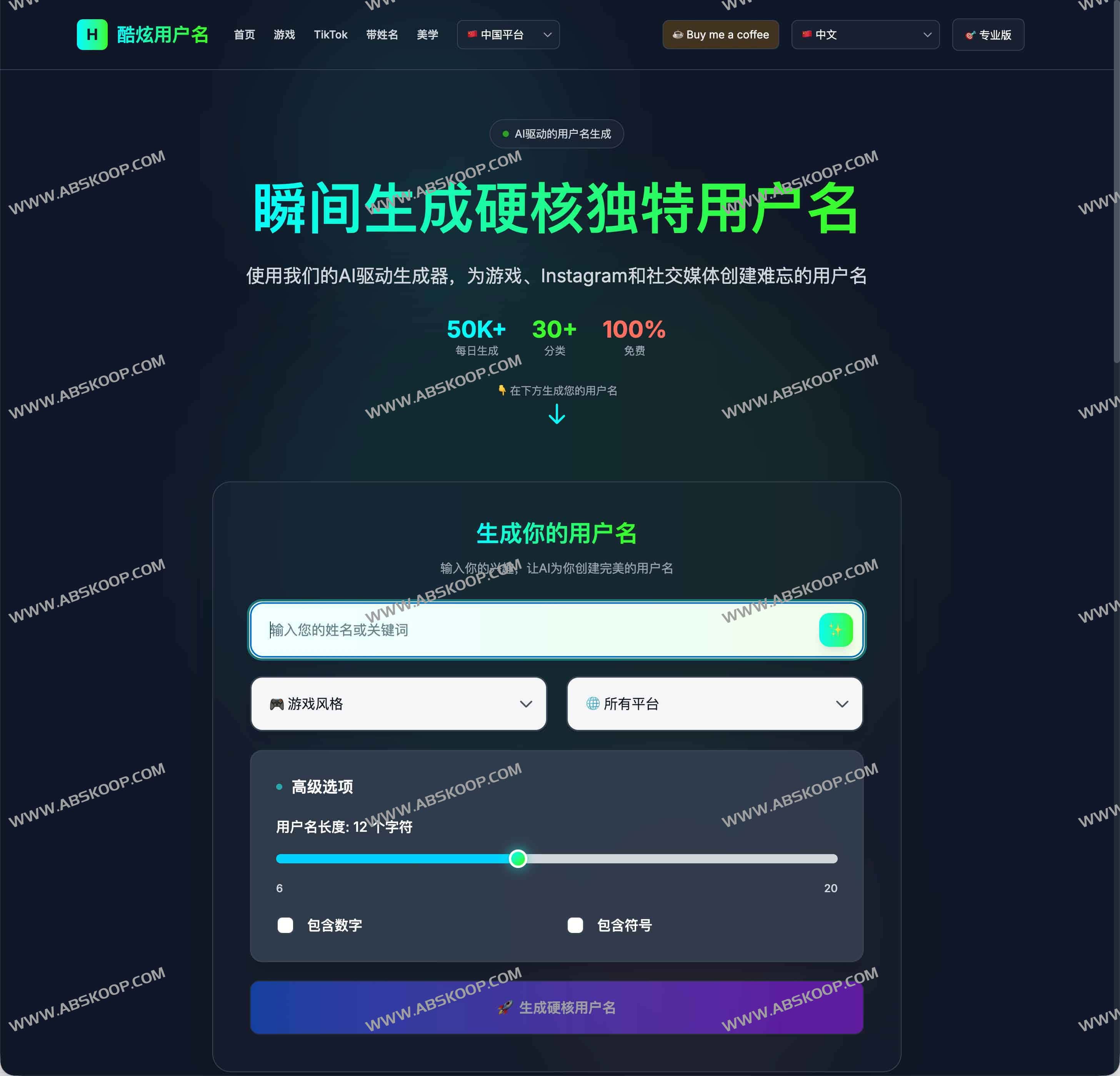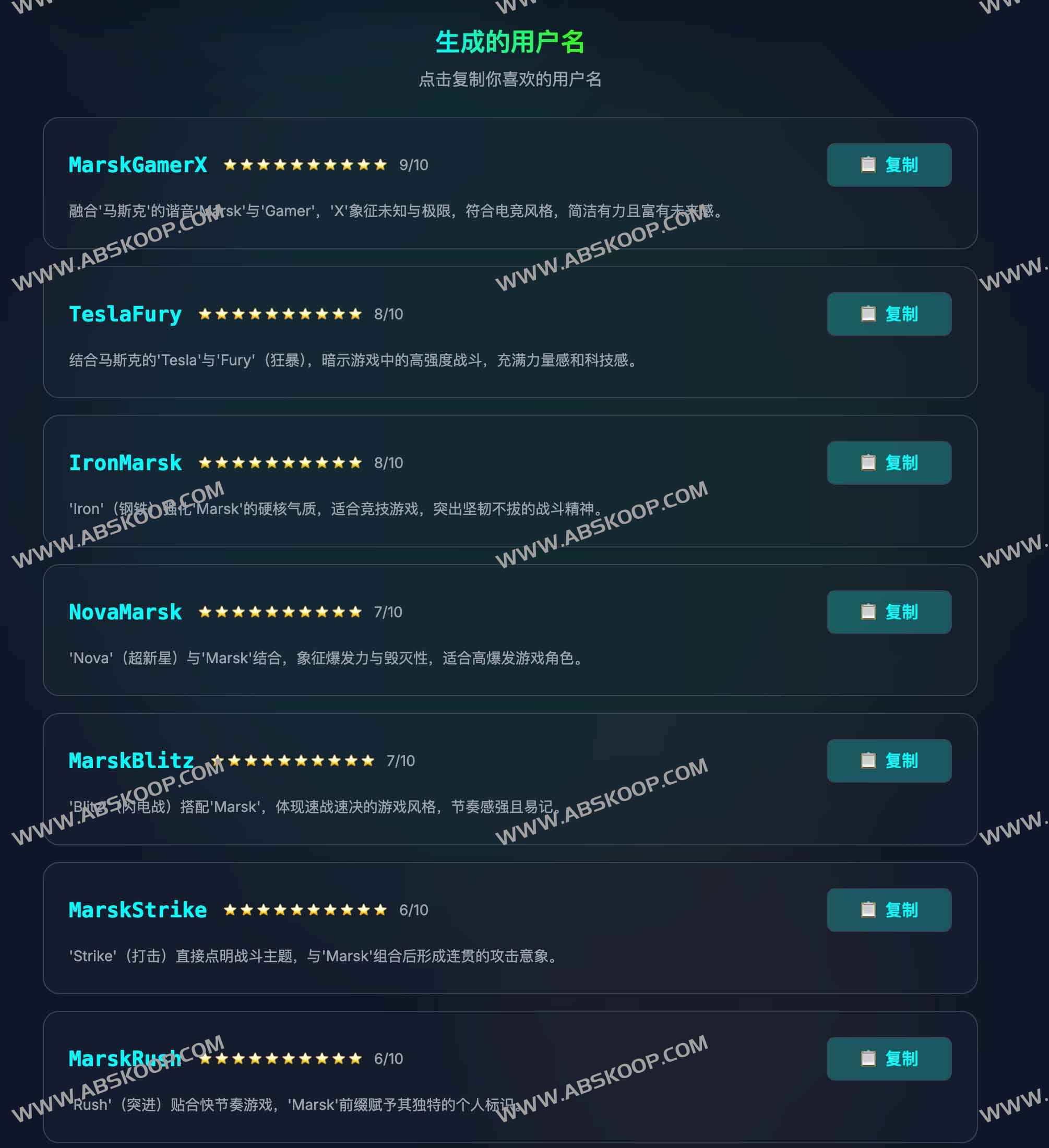 - 极速响应:几秒内生成 10 个候选用户名,支持复制粘贴操作 。