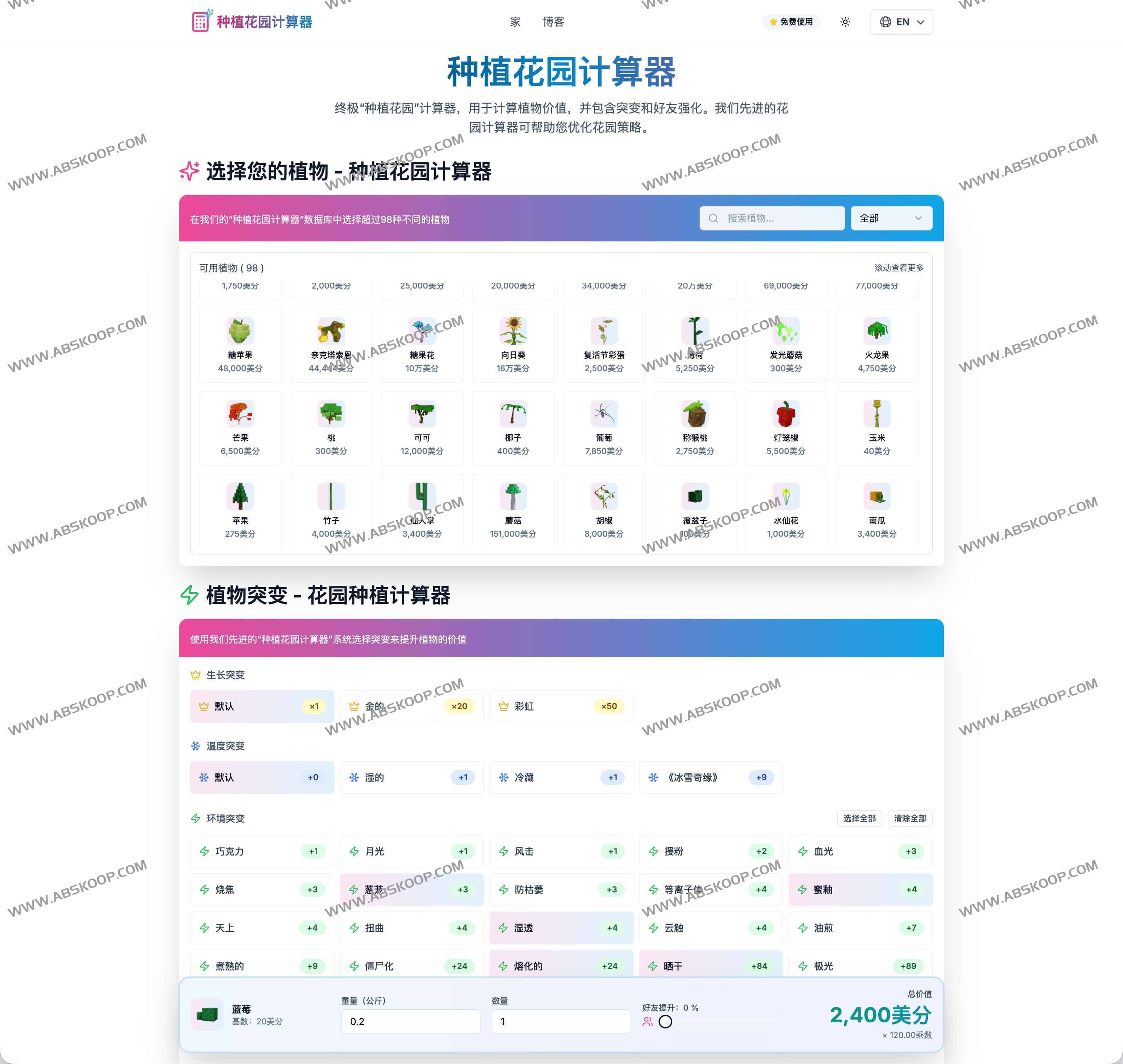 Grow A Garden Calculator 是一款专业植物价值计算器,帮助园丁通过设置基因突变、朋友加成和重量修正,精确评估每种植物的市场价值。用户可从 98 种常见与稀有植物中选择,内置成长突变、温度突变与环境突变等多层级变异系统,配合实时与批量计算功能,让复杂的园艺策略规划变得简单高效。
