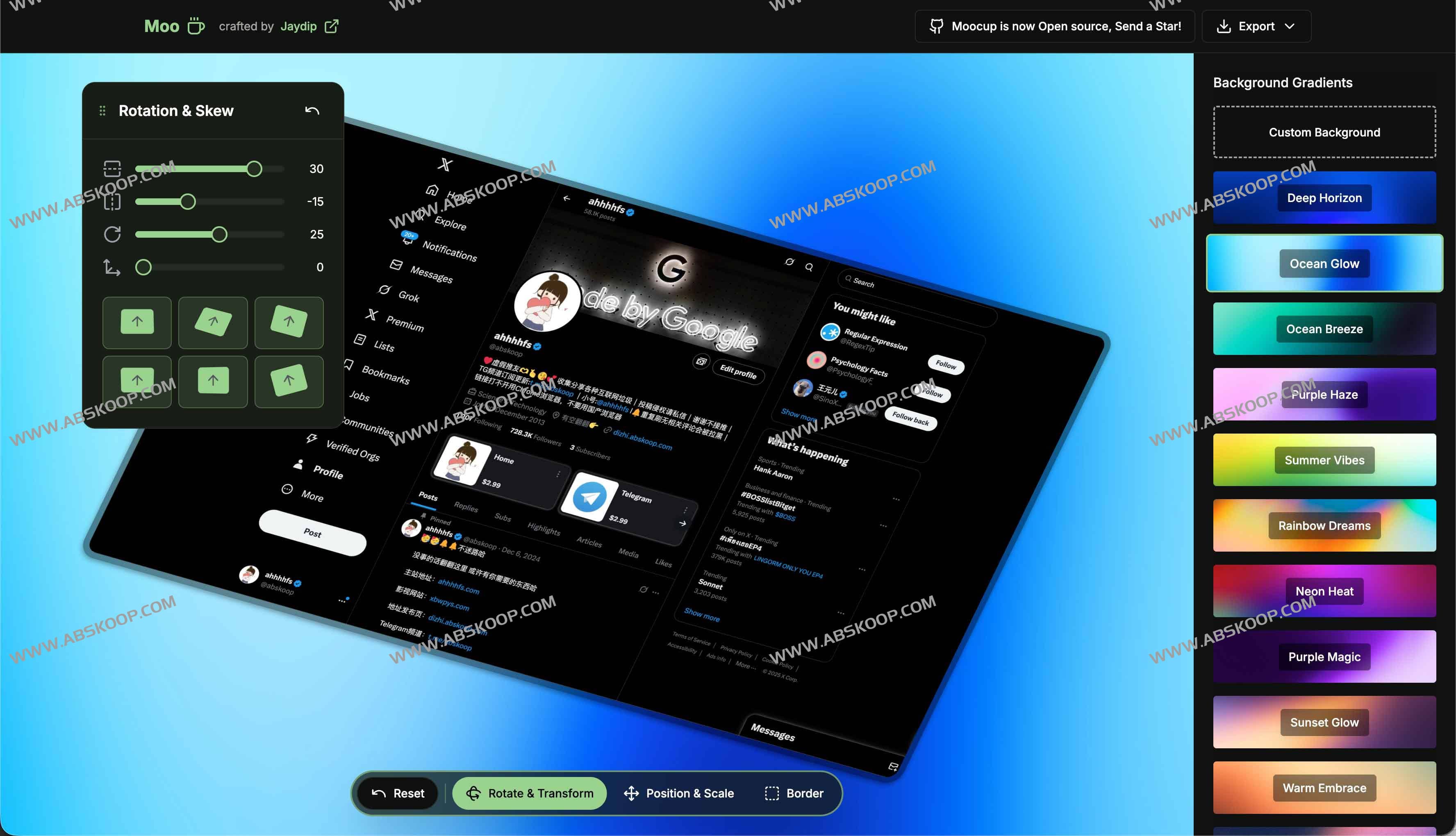 Moocup是由开发者Jaydip打造的开源视觉编辑工具,专为快速创建专业级3D效果图而生,帮助用户三秒打造惊艳3D效果图。用户只需上传截图,系统自动应用基础样式,通过自由调整旋转角度、倾斜度、位置缩放及边框,搭配深海/紫色迷雾/夏日氛围等渐变背景,瞬间生成具立体感的展示图。