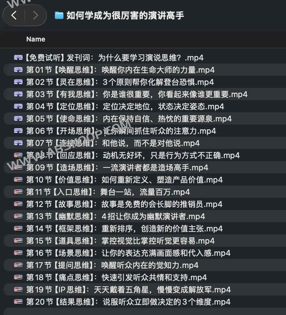 课程围绕20种表达思维展开,依次唤醒演讲者的自我认知、舞台意识与逻辑表达: