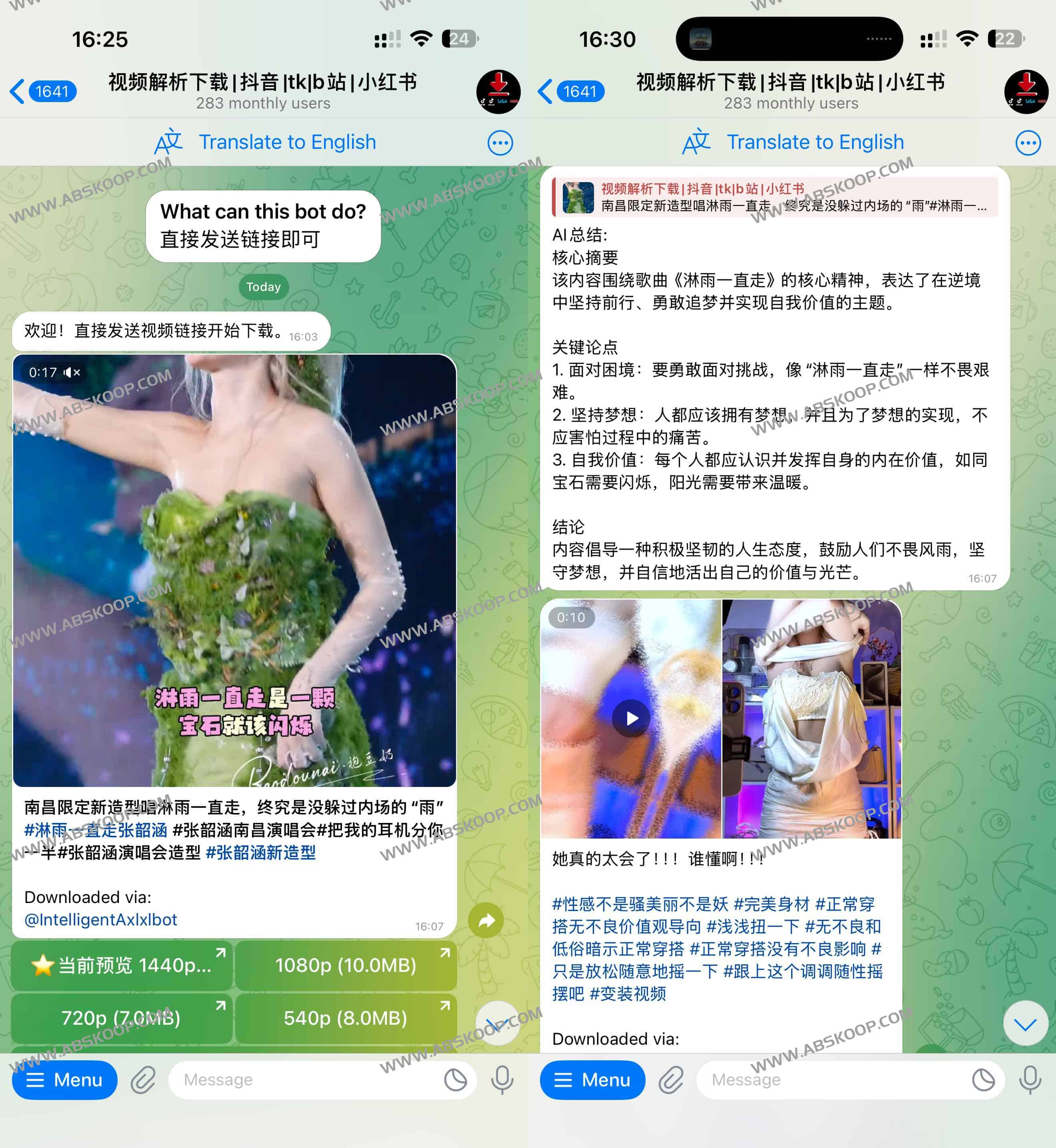@IntelligentAxlxlbot 是一款Telegram上 的视频解析机器人,可以轻松下载多个主流平台的内容,包括抖音、TikTok、B站、小红书、YouTube以及网易云音乐。用户只需将目标视频或音频的链接发送给机器人,即可快速获取下载链接,无需额外安装应用或插件。