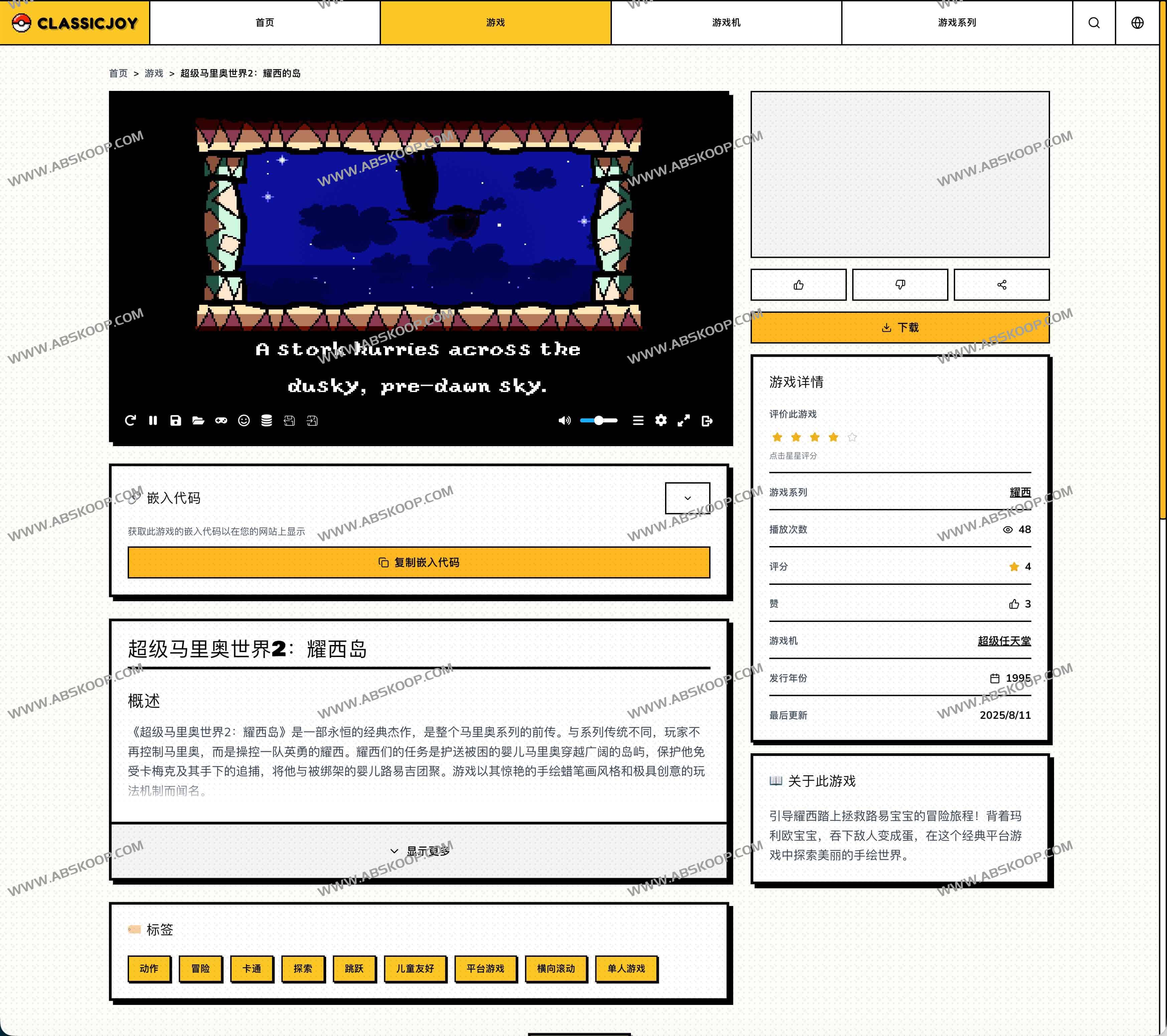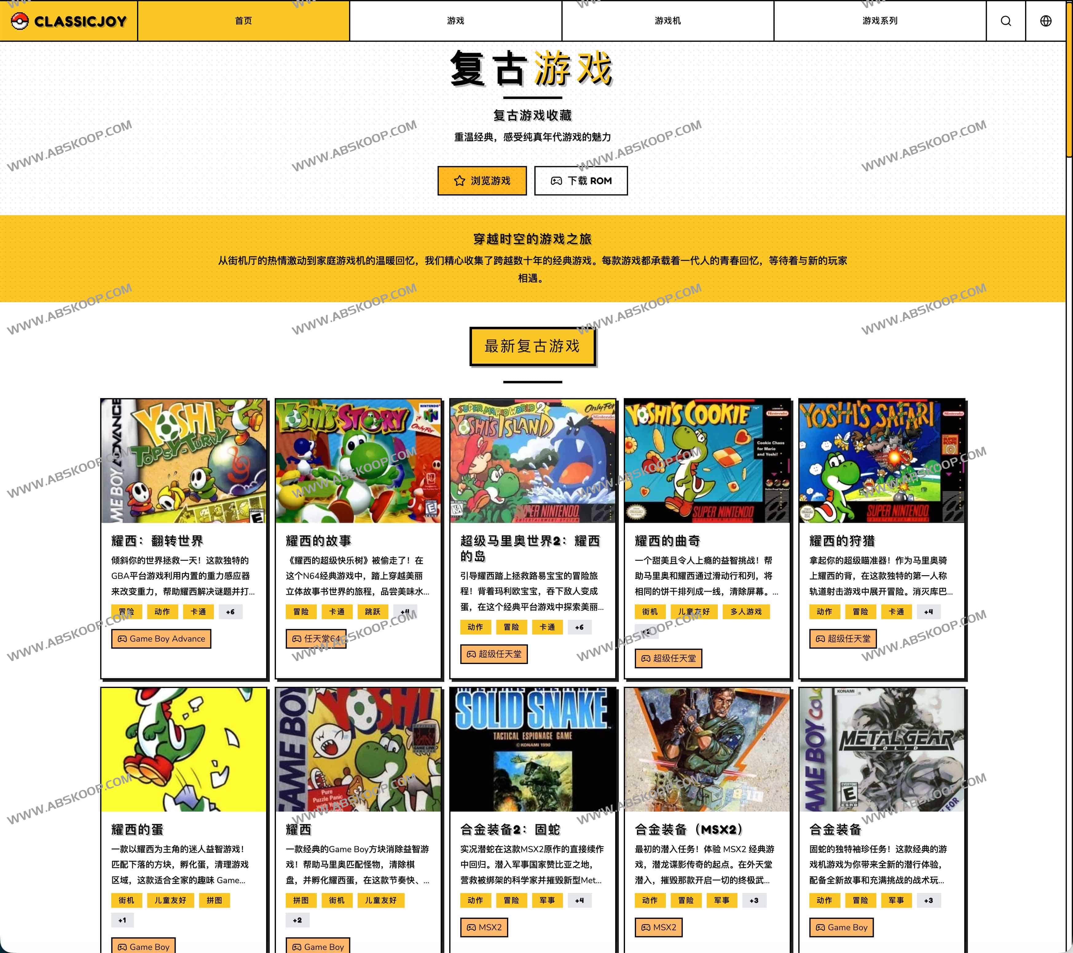 ClassicJoy 是一个为复古游戏爱好者打造的在线平台,汇集了上千款跨越数十年的经典游戏,从街机厅的热血瞬间到家用主机的温馨回忆应有尽有。无论是 NES、SNES、Game Boy、Sega Genesis 还是街机系统,玩家都能在这里直接通过浏览器畅玩,无需下载或安装任何软件。