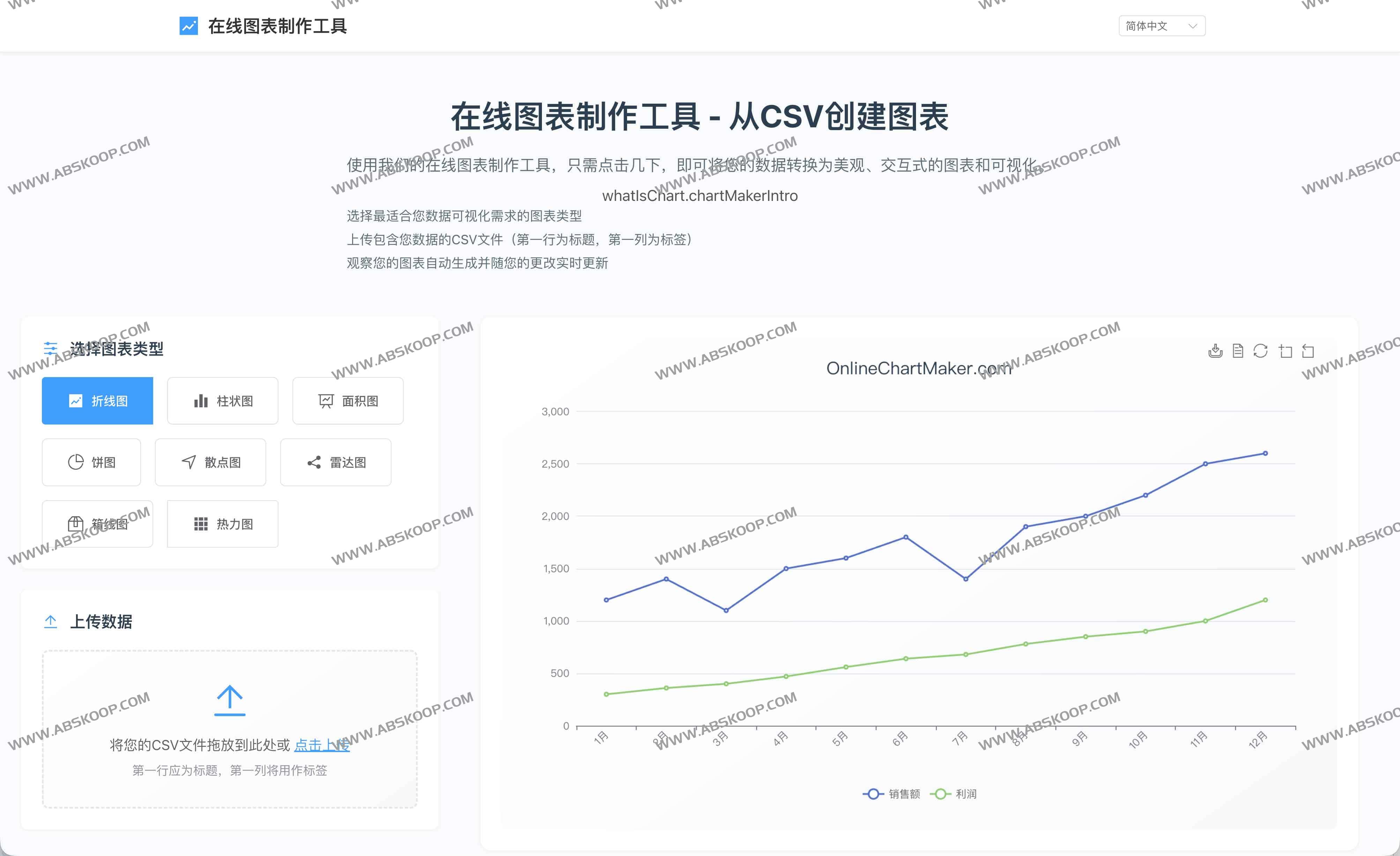 Online Chart Maker是一款无需安装、完全免费的在线数据可视化工具,支持从CSV文件快速生成多种专业图表,包括折线图、柱状图、饼图、散点图、雷达图等。用户可直接上传数据文件或手动输入数据,通过直观的界面完成图表生成、样式调整与导出,提供实时预览、多语言界面与便捷导出或分享功能。适合报告演示、数据分析与社媒配图等使用场景。