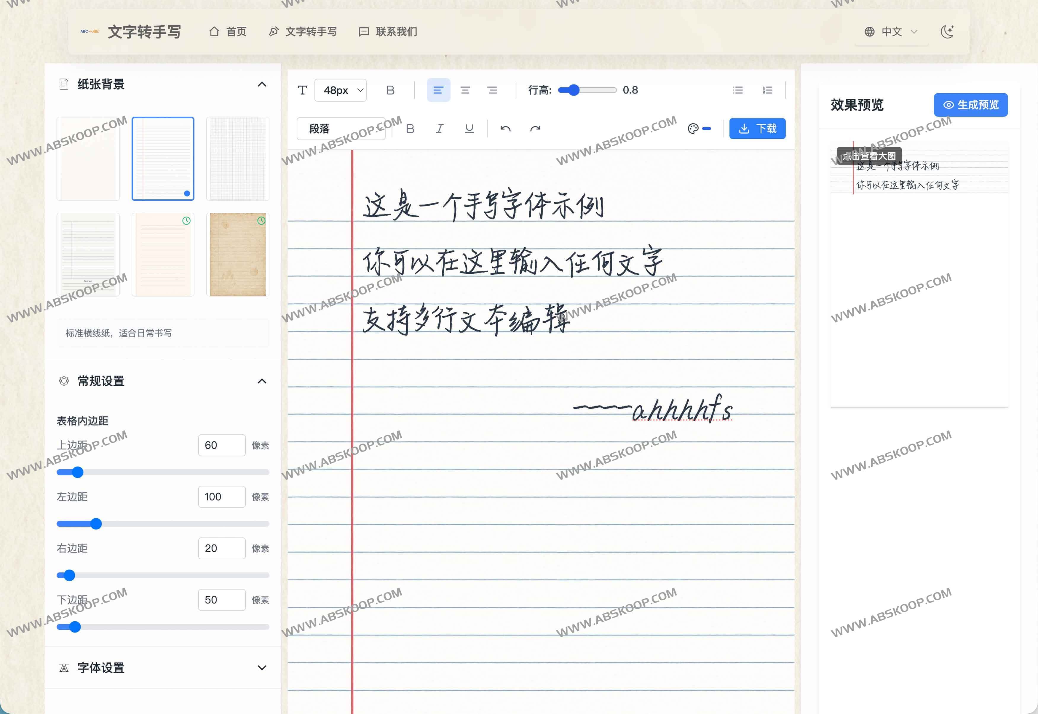 - 生成预览:快速查看手写效果并微调。