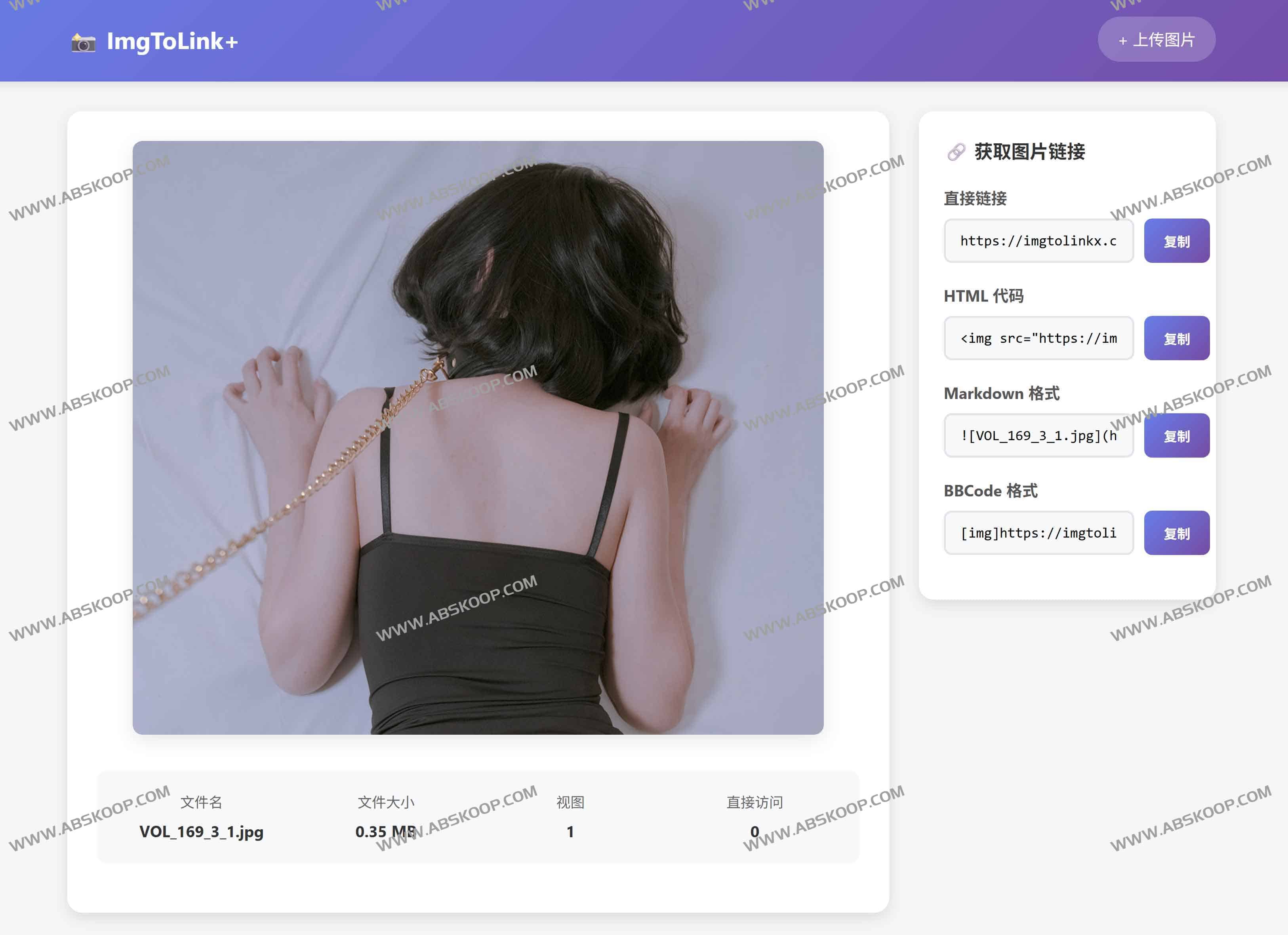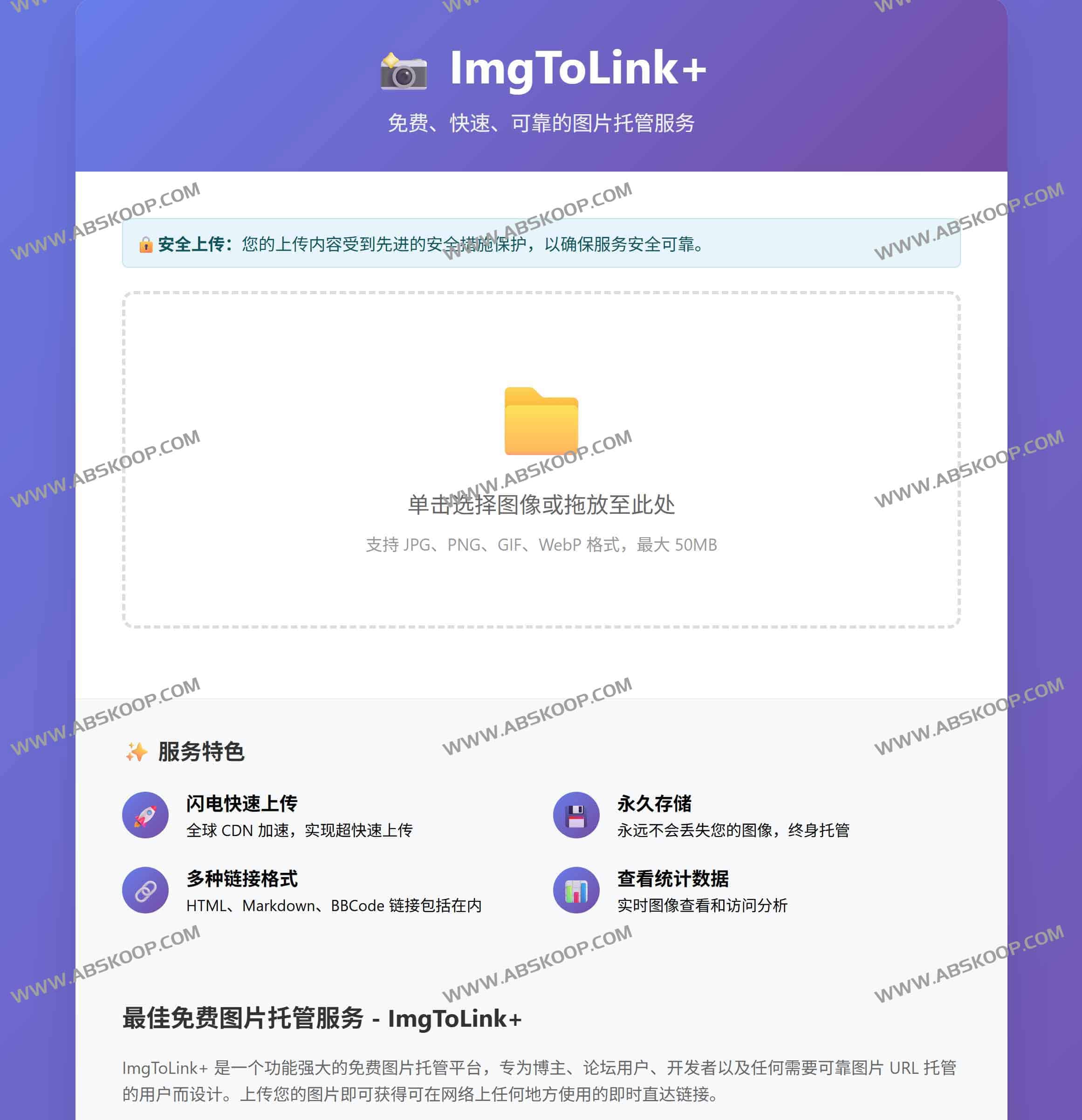 ImgToLink+是一款免费图床与直链生成器,提供免费、快速、安全的图片托管与外链服务,支持 JPG、PNG、GIF、WebP 等格式,支持单文件最高 50MB,上传后可立即获取直链与多种嵌入代码,包括 HTML、Markdown、BBCode,适配博客、论坛、社交平台与开发场景,服务承诺永久存储与全球 CDN 加速,带来快速、稳定的加载体验。