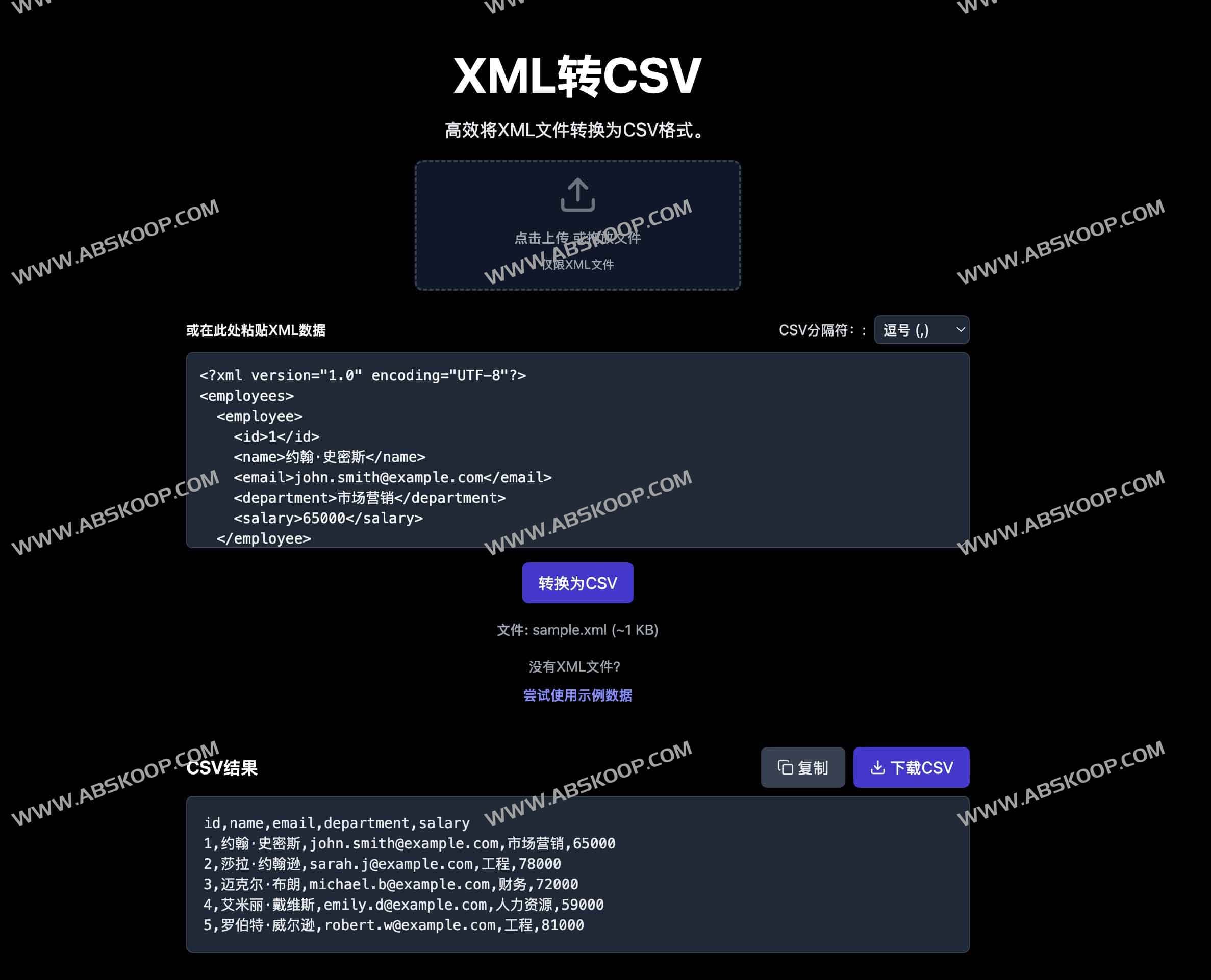 - CSV → Markdown 表格、HTML 表格、PDF 文档、SQL 插入语句、vCard