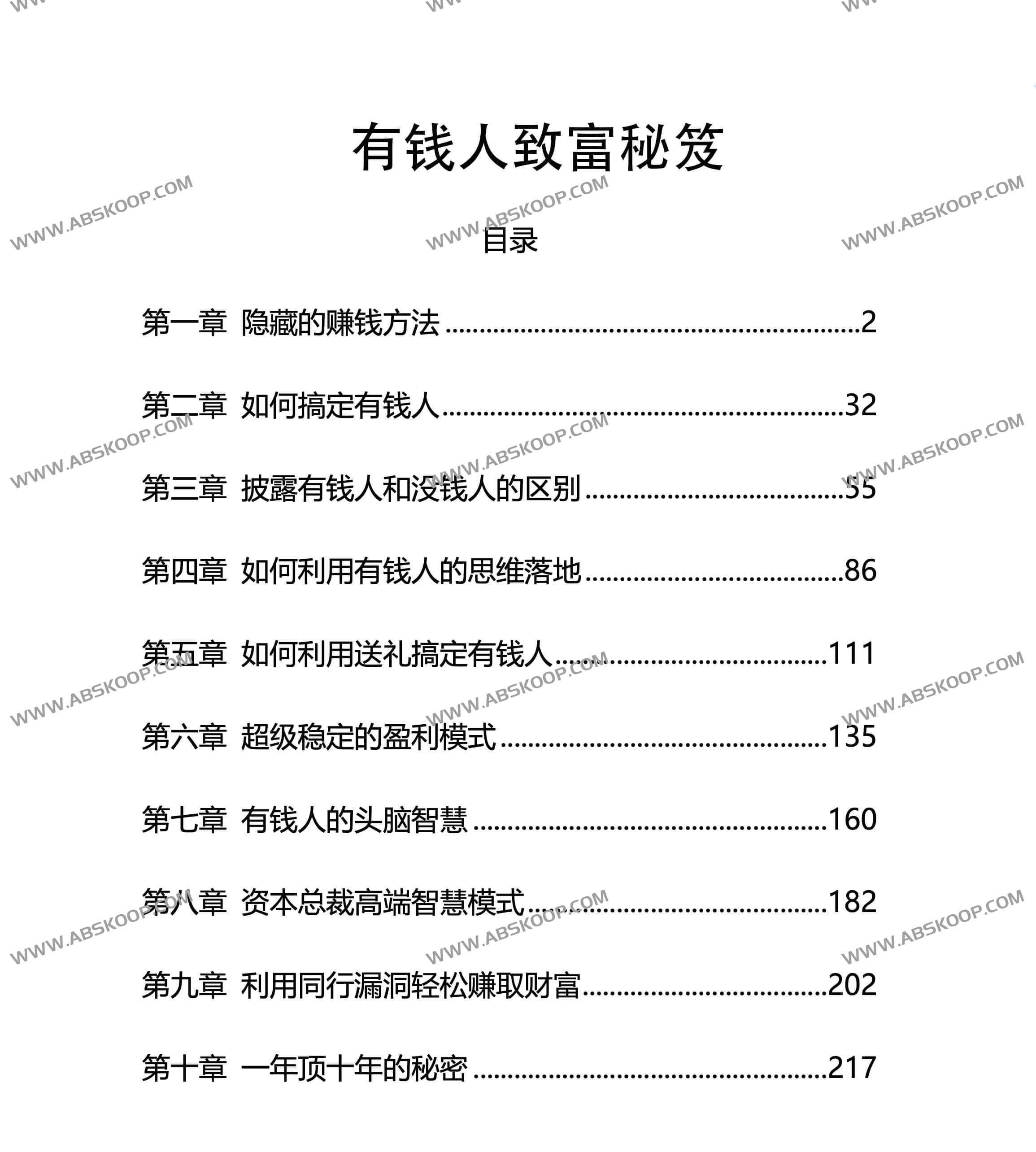 《有钱人致富秘笈》直击财富世界的本质,揭示普通人难以触及的底层规律。书中不仅拆解了有钱人如何思考和决策,还揭开了那些常被忽略的暴利赚钱模式,帮助读者跳出固有思维,掌握快速积累财富的关键方法。