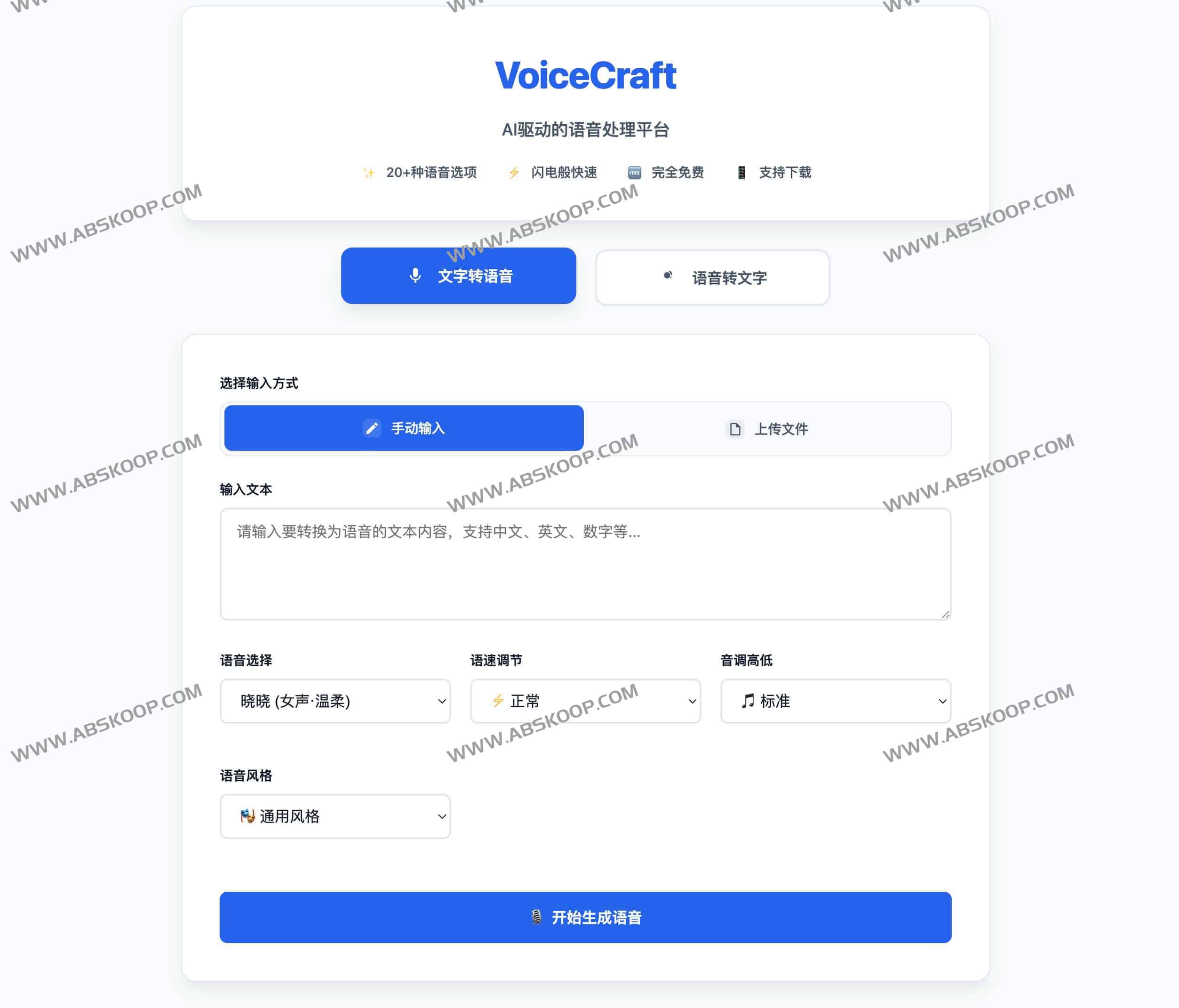 VoiceCraft 是一个完全免费的 AI 驱动语音处理平台,提供文字转语音(TTS)与语音转文字(STT)两大核心功能。平台内置超过 20 种语音选项,包括微软官方的中文语音角色,如“晓晓”,用户可自由选择语速、音调和风格,满足多样化的声音需求。体验地址:https://tts.wangwangit.com/