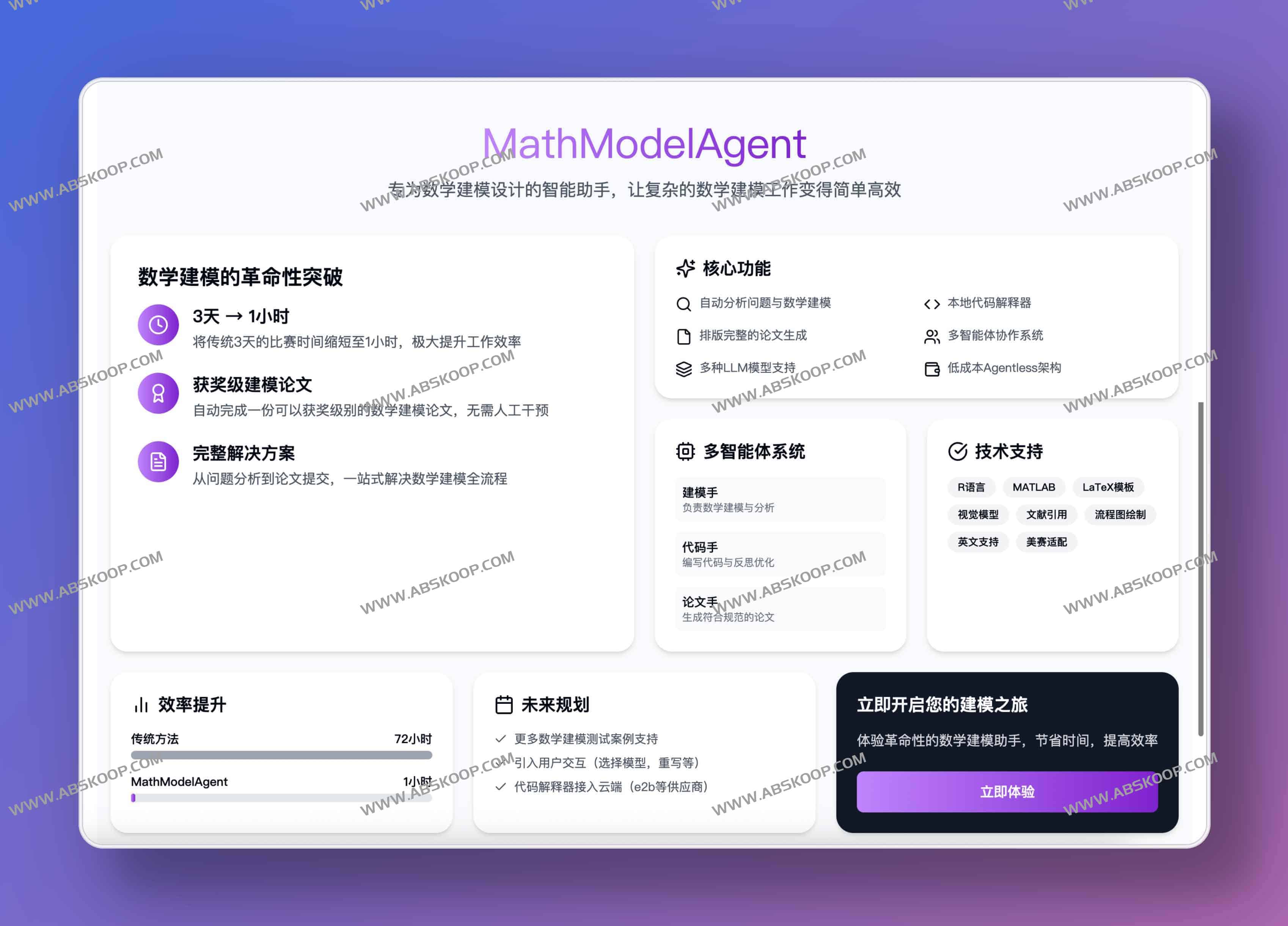 MathModelAgent 是一款专为数学建模设计的智能助手,能够自动完成从问题分析、模型建立、代码编写到论文生成的全流程。用户只需投入极少时间,即可获得一份完整、规范且具备获奖潜力的建模论文,大幅提升效率。