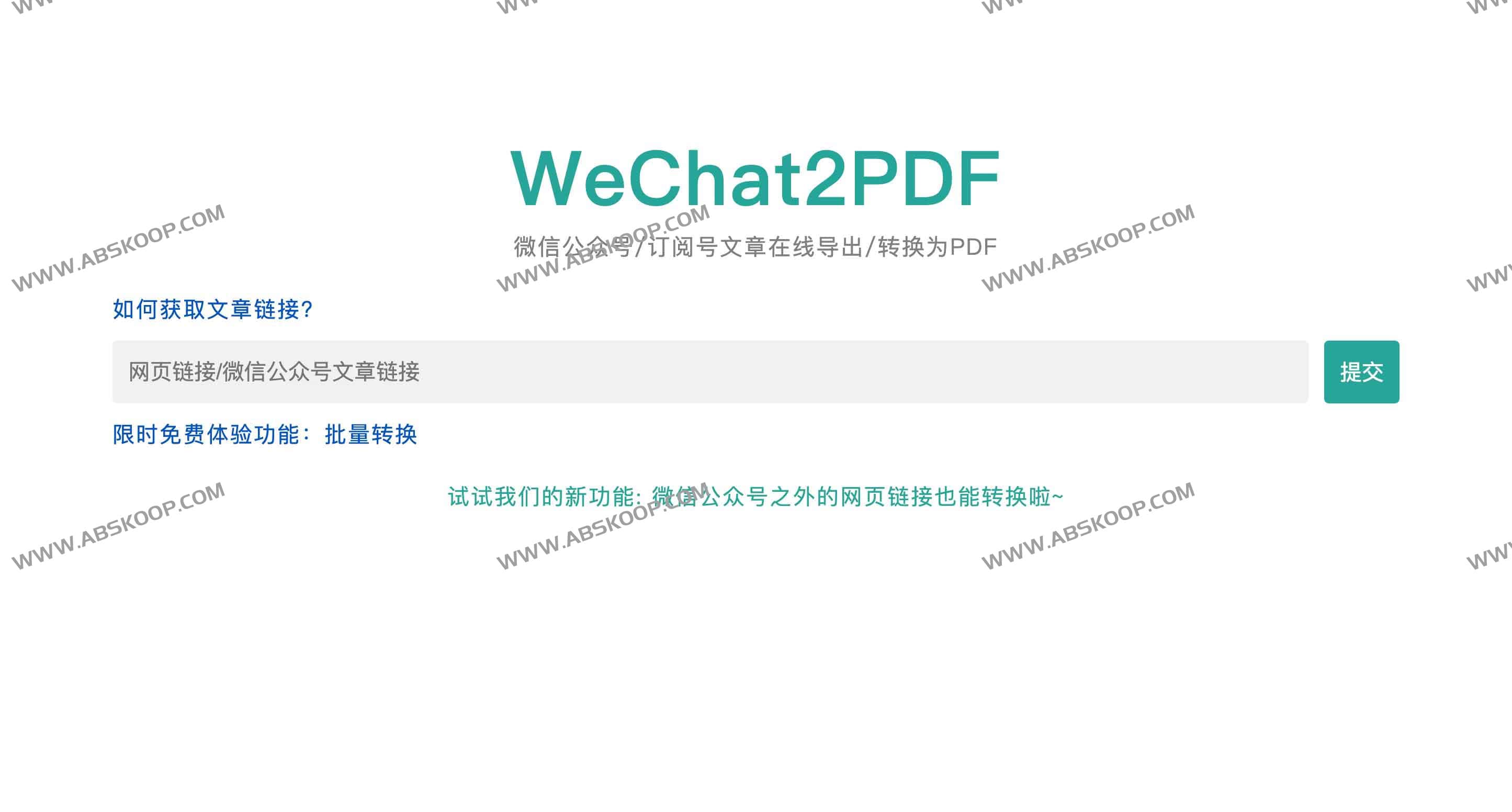 WeChat2PDF 是一个在线工具,用于将微信公众号(订阅号 / 服务号)文章导出并转换为 PDF,便于保存、打印或离线阅读。支持批量链接处理,保留原有排版与图文内容;普通网页链接也可转换为 PDF。访问地址: https://www.wechat2pdf.com/