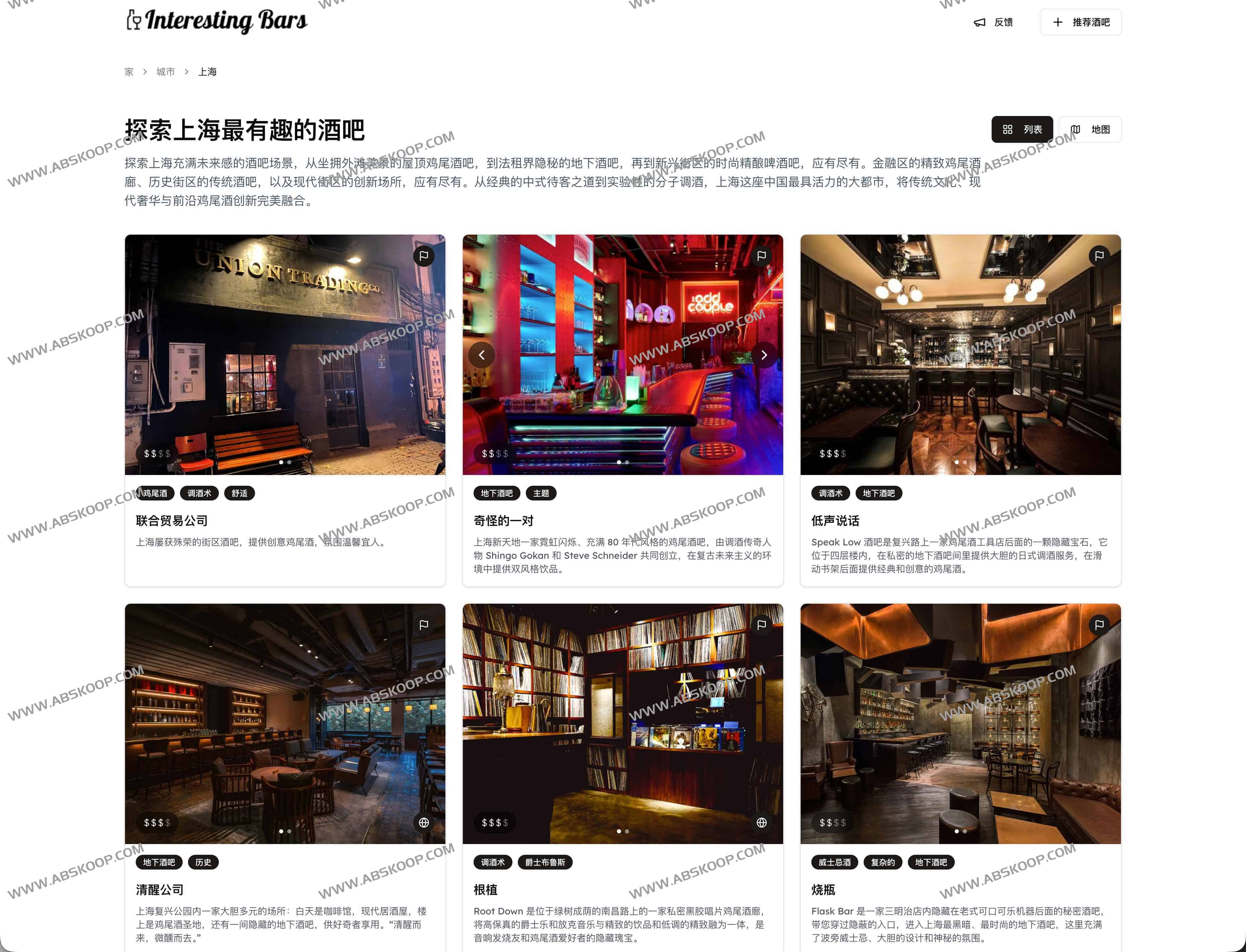 - 按城市与类别浏览:如秘密酒吧、屋顶、鸡尾酒等