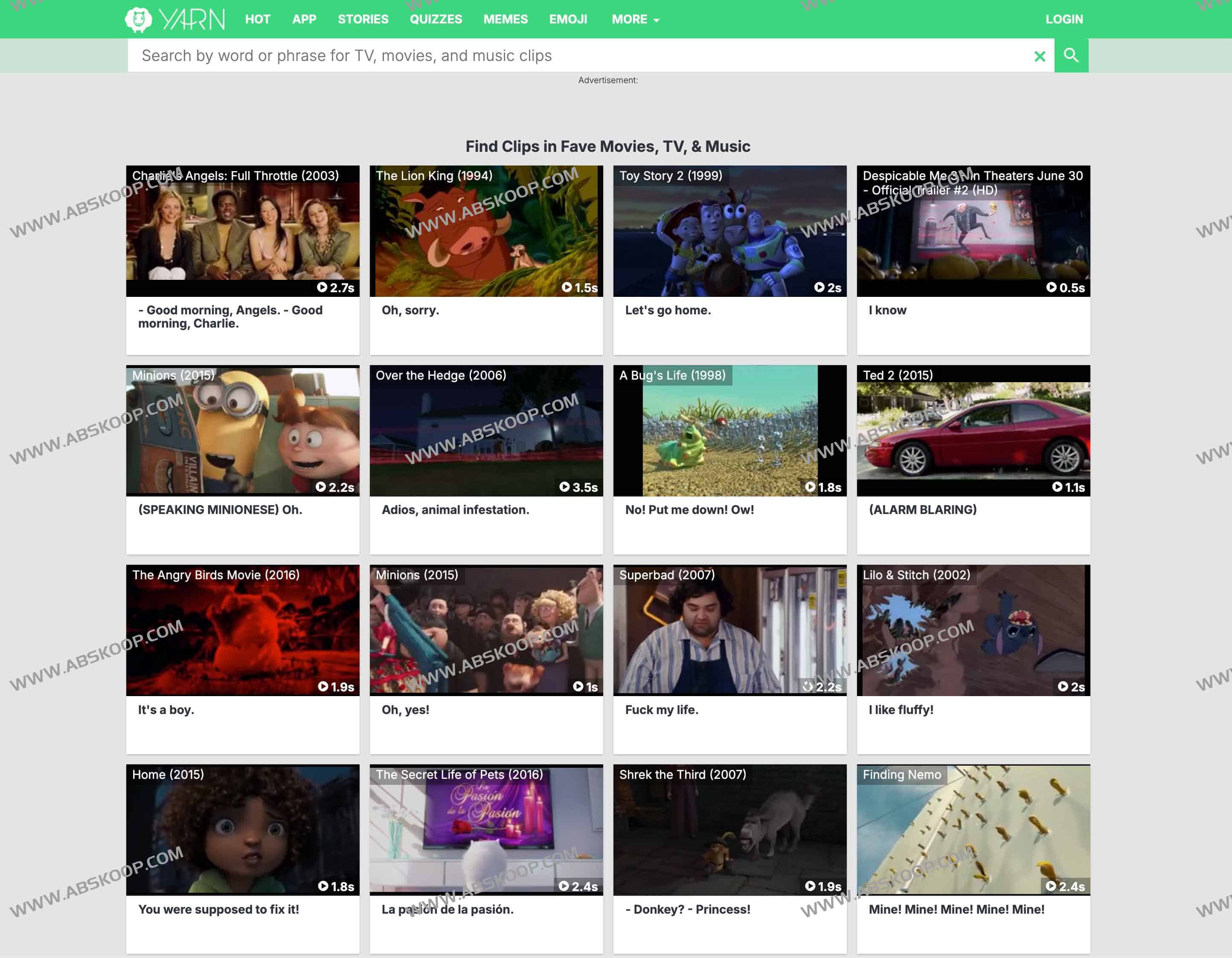 YARN(GetYarn.io / yarn.co)是一个“按台词找片段”的搜索与发现平台。输入一句话或关键词,就能快速定位电影、电视剧和音乐视频中的对应画面,并提供可播放剪辑、上下文、角色对白与时间戳信息。平台聚合自网络的热门与高质量内容,按热度与标签组织,便于检索与社交分享。支持中文台词,但数量相对较少。