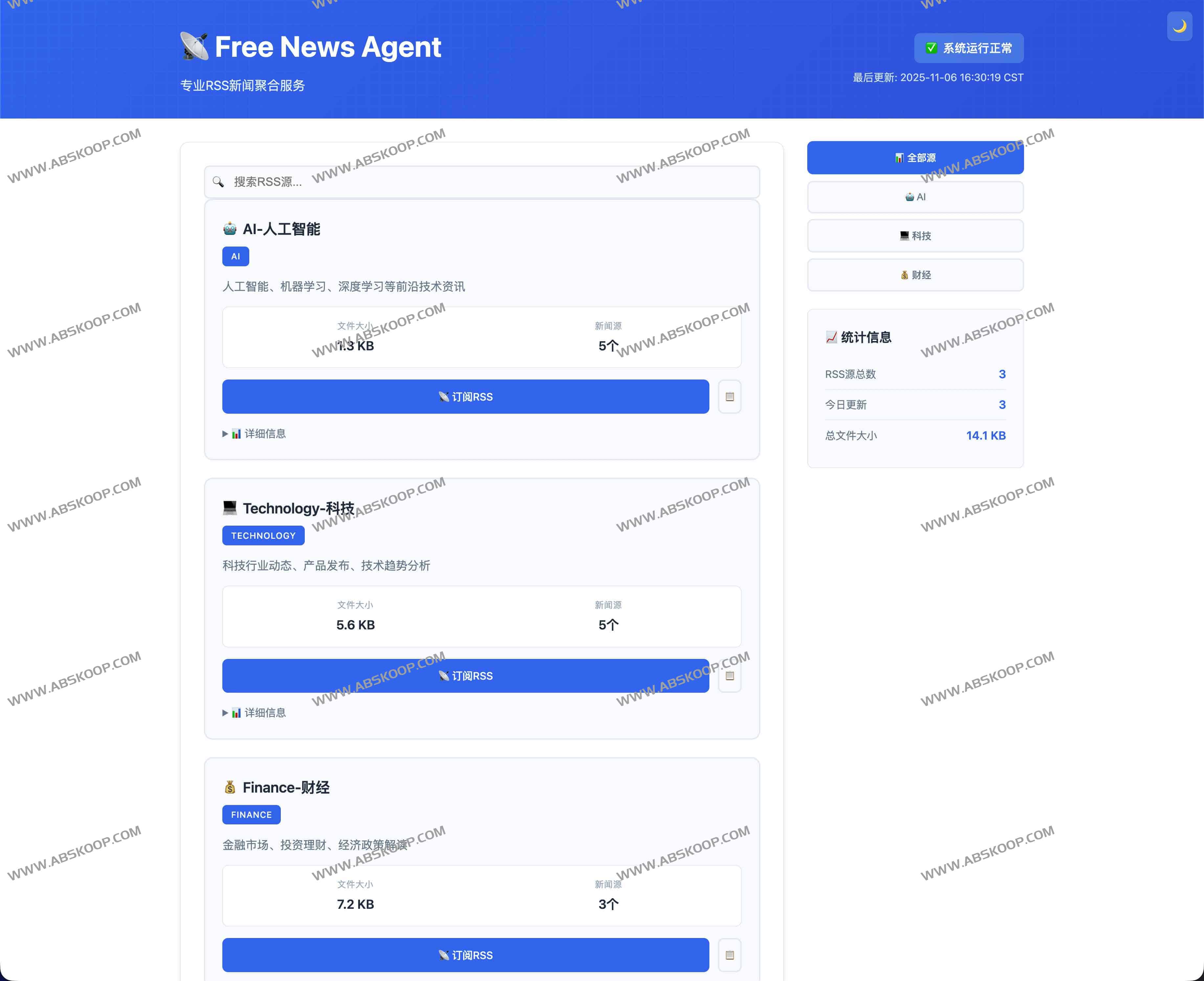 News-Agent 是自动化的新闻聚合与 RSS 订阅源生成器。通过 GitHub Actions 拉取多源 RSS,完成智能去重与分发,输出标准化订阅源并托管到 GitHub Pages,便于随时订阅与分享。支持 AI、科技、财经等多个分类。