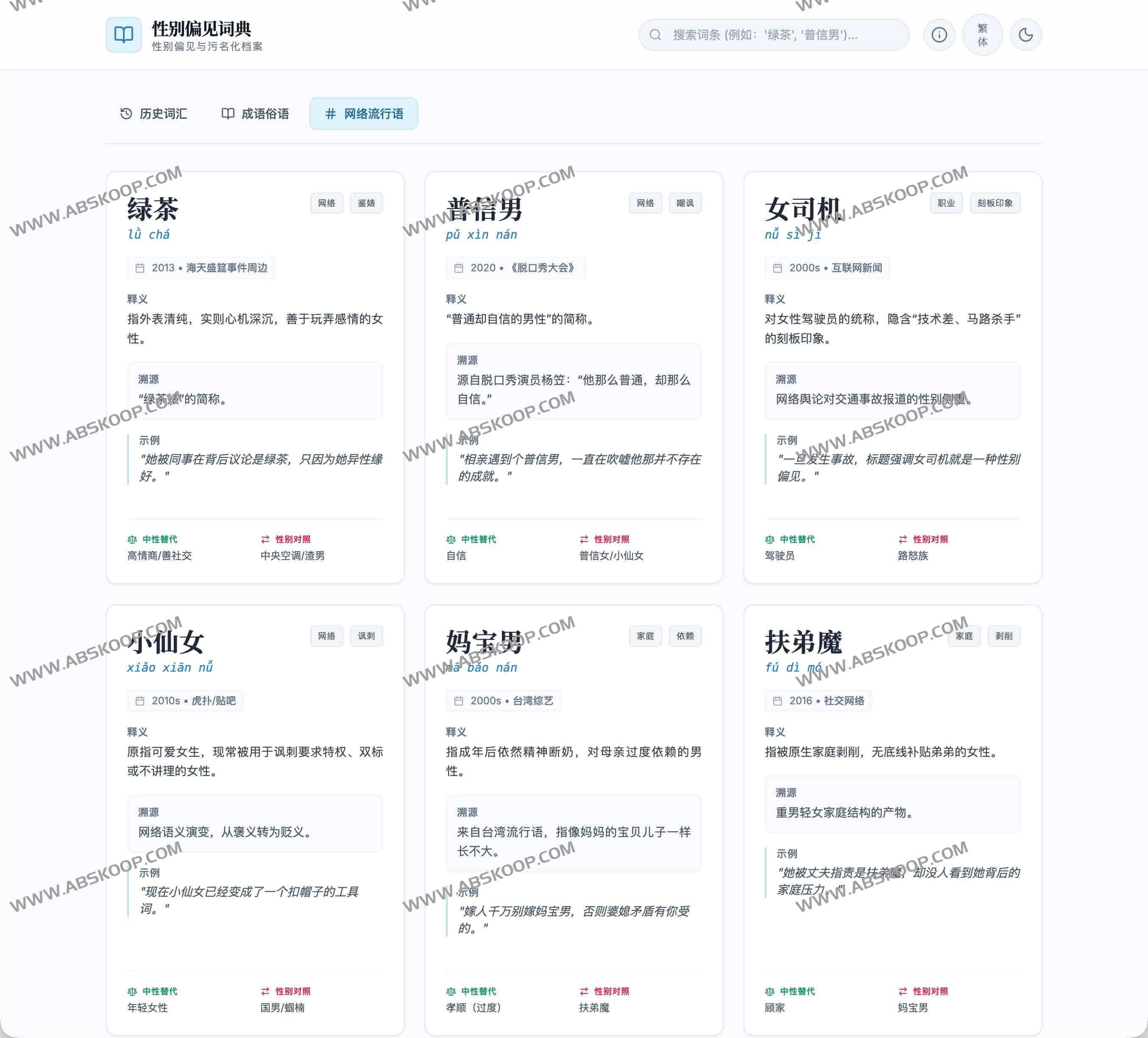 “性别偏见词典”是一项面向中文世界的数字人文项目,收录并解析用于污名化、刻板化或歧视特定性别的词汇与成语,呈现其语义演变、社会语境与潜在影响。项目关注历史与当下的连续性,从“红颜祸水”“面首”到“绿茶”“普信男”等现代用语,力求以客观资料帮助读者识别语言中的偏见结构,理解其成因并寻找更中性的表述路径。网站由小声读书维护,旨在促进性别交流与互相理解。