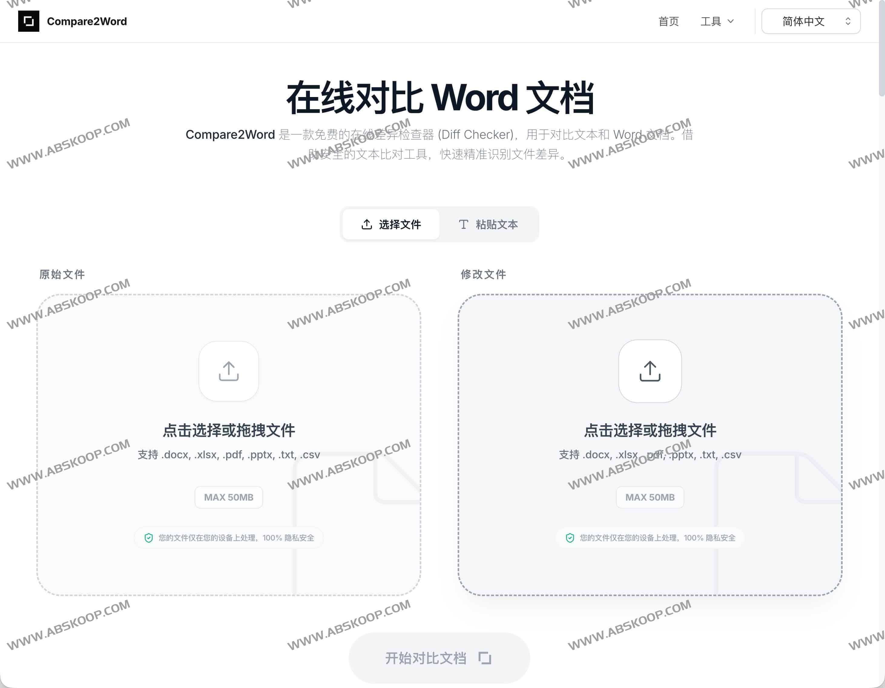 打开浏览器访问 Compare2Word 网站,拖拽文件即可开始对比,无需安装任何软件,也不依赖操作系统。