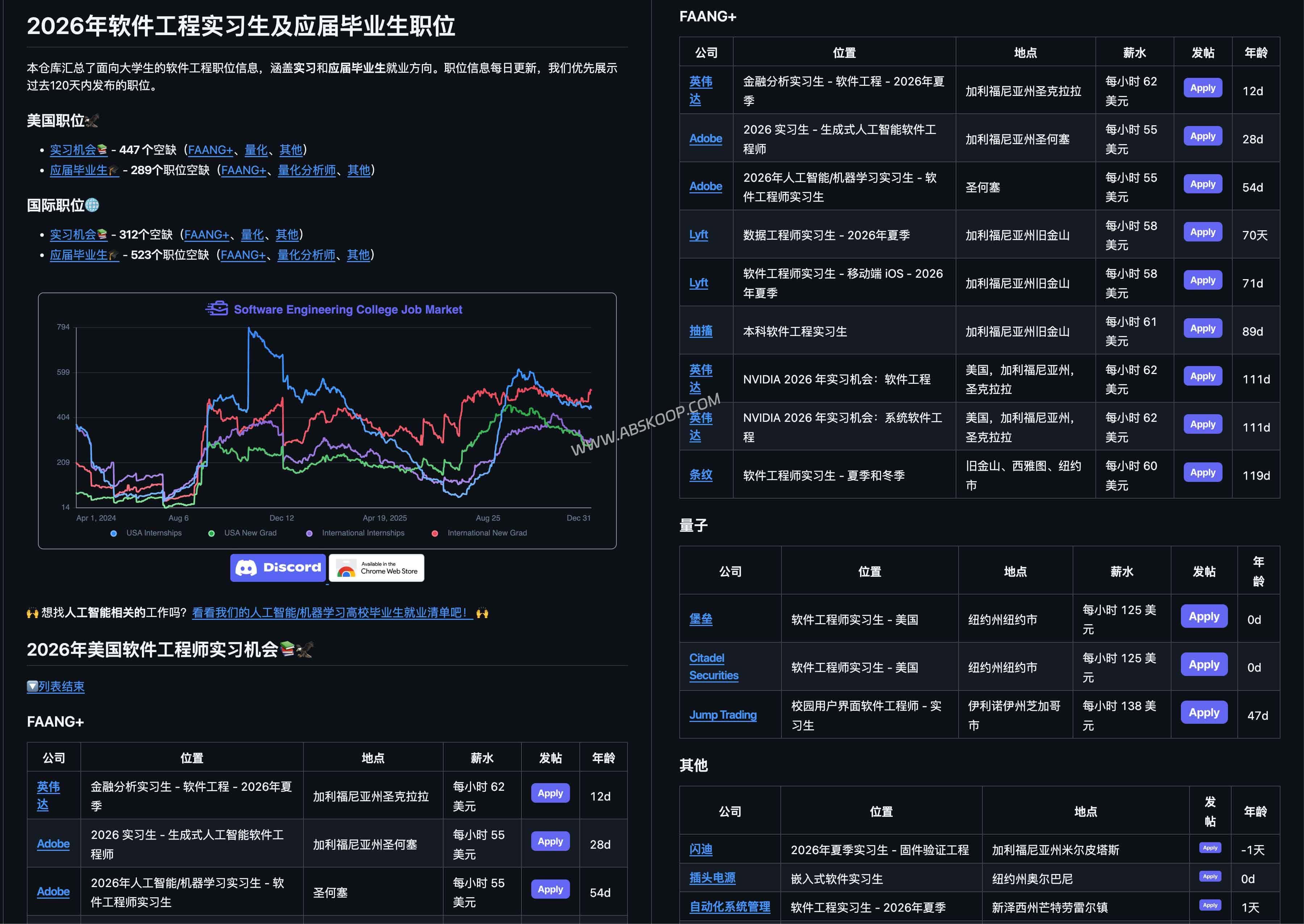 每个岗位按公司类型(FAANG+、Quant、其他)、地区和职位类型分门别类,帮助你更高效定位心仪职位。通过 GitHub 项目主页或加入 SpeedyApply 的 Discord 社区,可第一时间掌握每日新增机会。