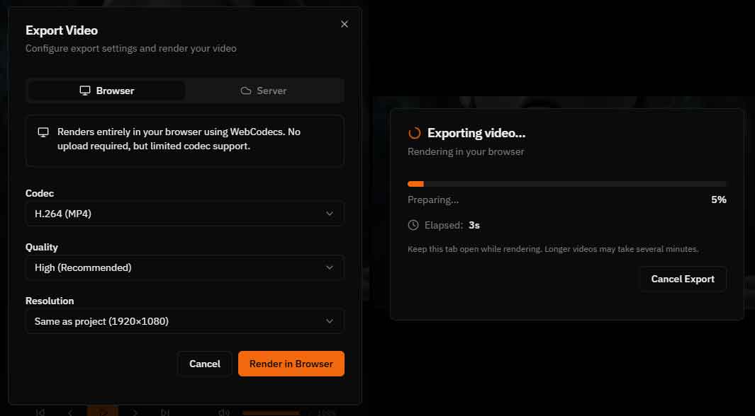 按目前的设计,它通过引用本地文件进行操作,渲染和导出主要在浏览器本地完成,不依赖外部服务器来处理视频素材。